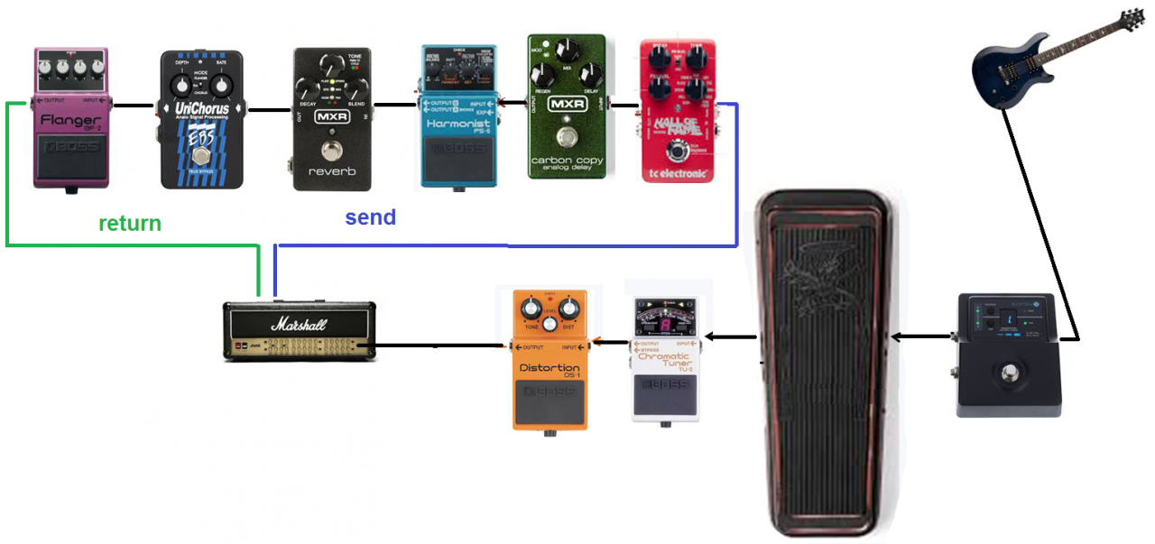 Ich kann ja meine Pedale direkt verkabeln oder den Einschleifweg verwenden. Bis anhin hab ich mich erfolgreich in den letzten 15 Jahren Bandtätigkeit davor gedrückt und einfach alles der Reihe nach angeordnet. Jetzt möchte ich aber mal einen Schritt vorwärts kommen und nicht nur an meinem Spiel, sondern auch am Sound arbeiten. Auslöser dafür war der Kauf des Boss PS-6 Harmonizers, welcher in den Youtube Videos einfach super klingt (auch in Amateurvideos), jedoch in meinem Setting einfach nur Donald Duck-mässig harmonisiert.