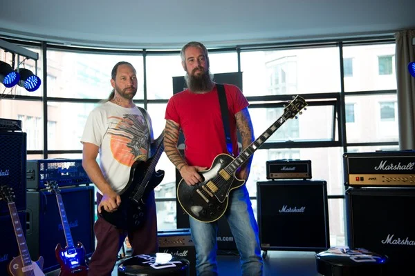 Wir haben uns etwa 2 Stunden vor unserem Termin mit der Band im Gibson-Showroom auf einen Kaffee getroffen, um die Fragen durchzugehen und den Ablauf zu besprechen. Tatsächlich war Chris den ganzen Tag derartig nervös, dass ich zwischenzeitlich etwas besorgt um ihn war. Wir haben gemeinsam die Fragen etwas umformuliert und sind das Interview einmal komplett durchgegangen, damit er möglichst gut vorbereitet vor seine Helden treten konnte.