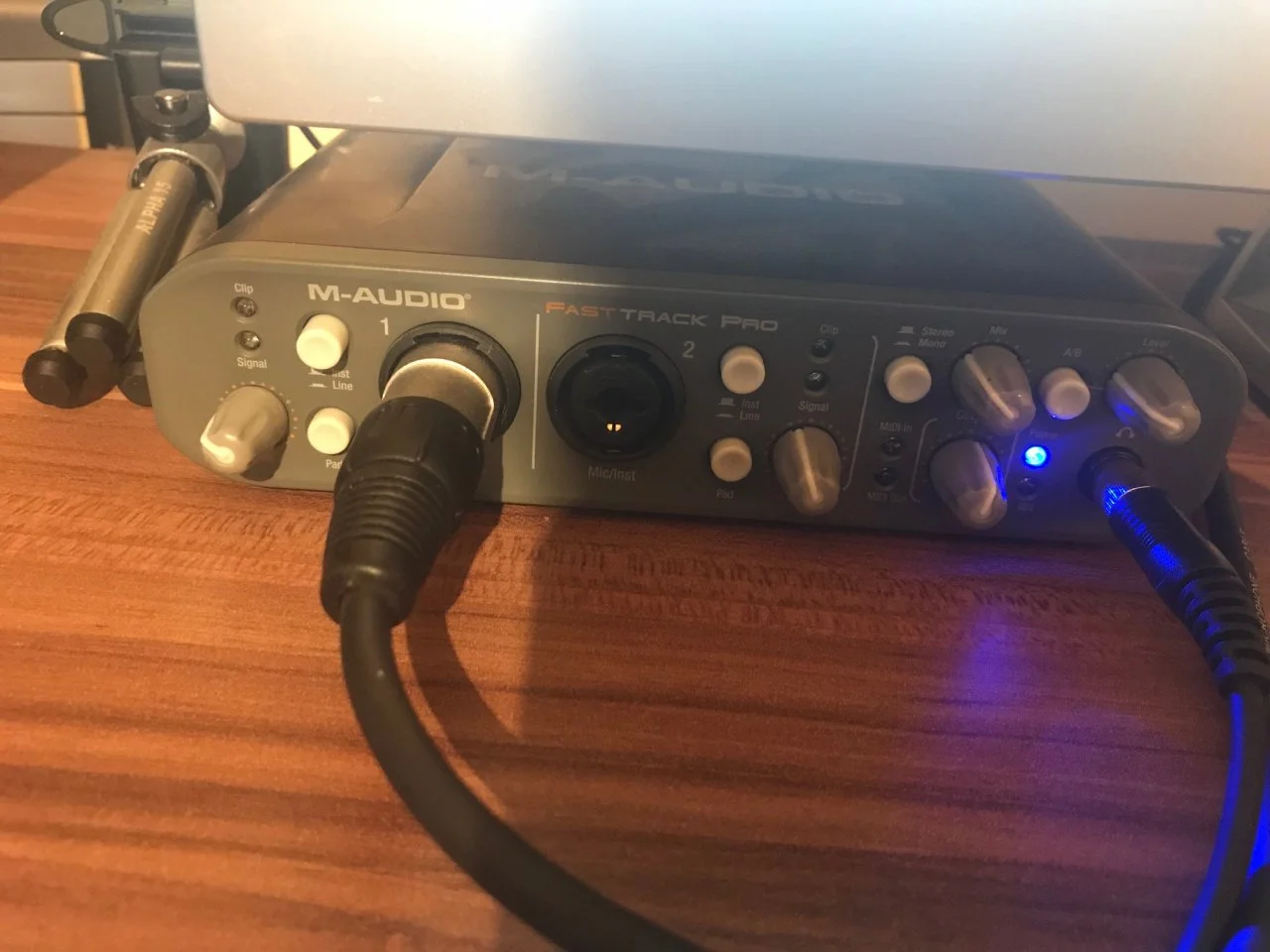 Ich habe ein Rode NT1 Mikrofon über ein XLR an mein M-Audio Fasttrack Pro Interface verbunden.