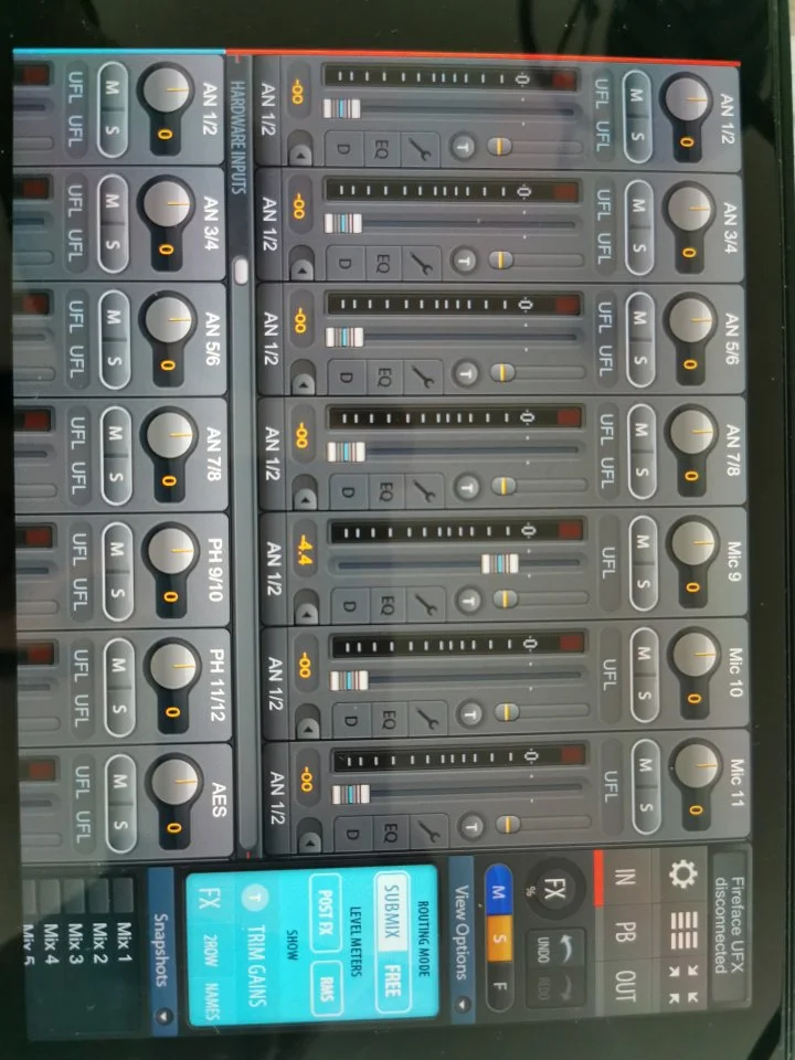 Nochmal ein kleines Update meinerseits. Ich habe mir ein Fireface UCX zugelegt, da es class compliant ist und zudem etwas ausgestatteter als das Fireface UC. Hat jemand Erfahrung mit der TotalMix FX Software (nicht Remote) am IPad? Habe alles so angeschlossen wie im Handbuch angegeben und auch Google, Youtube etc haben mir nicht weiterhelfen können.. Egal was ich mache, TotalMix zeigt mir immer nur die Nachricht oben rechts an "Fireface UFX disconnected".