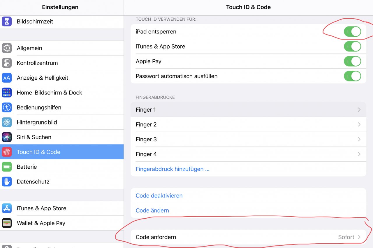 Ich möchte ja Touch ID nicht ausstellen. Ich möchte es schon grundsätzlich an lassen - die zusätzliche Codeeingabe alle paar Tage ist schon auch OK. Ich möchte nur nicht im ungüstigen Moment damit erwischt werden.In den iPadeinstellungen unter Touch ID & Code, ist ganz oben der Schalter iPad entsperren. Wenn dieser auf AUS steht findest du weiter unter „Code anfordern“ und kannst dort die Zeit einstellen, wann der Code angefordert wird. (Bild 3)