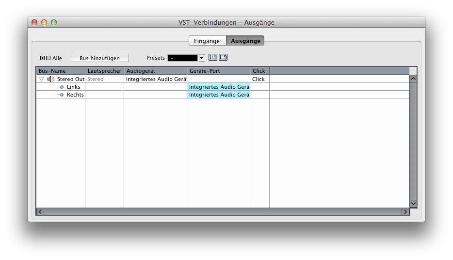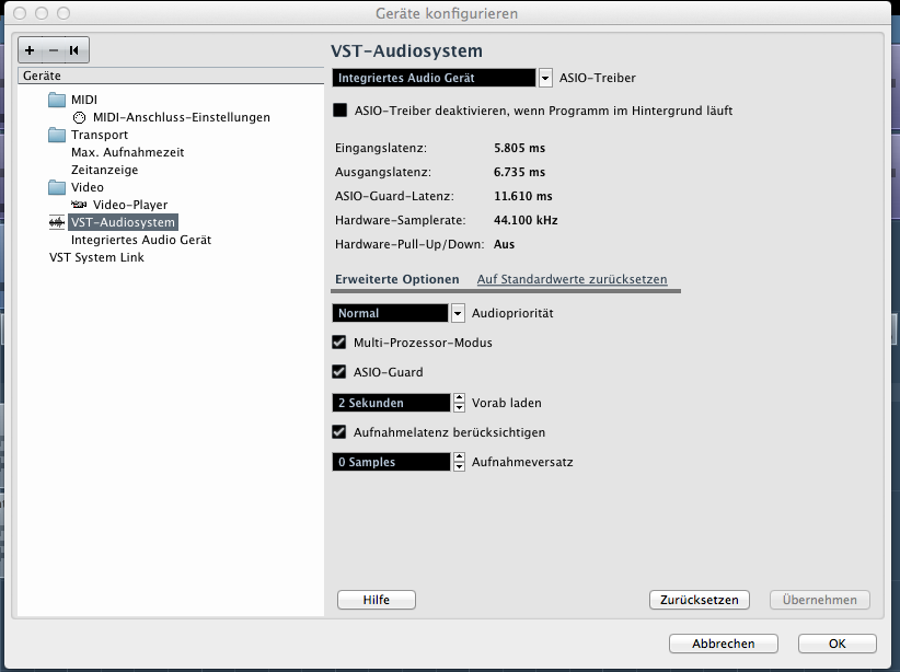 Als Hardware, bzw. Soundkarte wollte ich die interne SOundkarte meines MacBooks verwenden, da ich nur was als Intro zusammenklicken wollte mit den entsprechenden Sound-Samples. Habe als "Interface" die "Interne Soundkarte" gewählt, sowie als Ausgang Standard Output L + R.