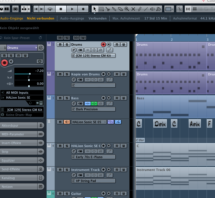 Habe ein neues Projekt angelegt - eine Drum-Spur per Pianoroll war schon vorhanden - und dann drei WAV-Dateien importiert.