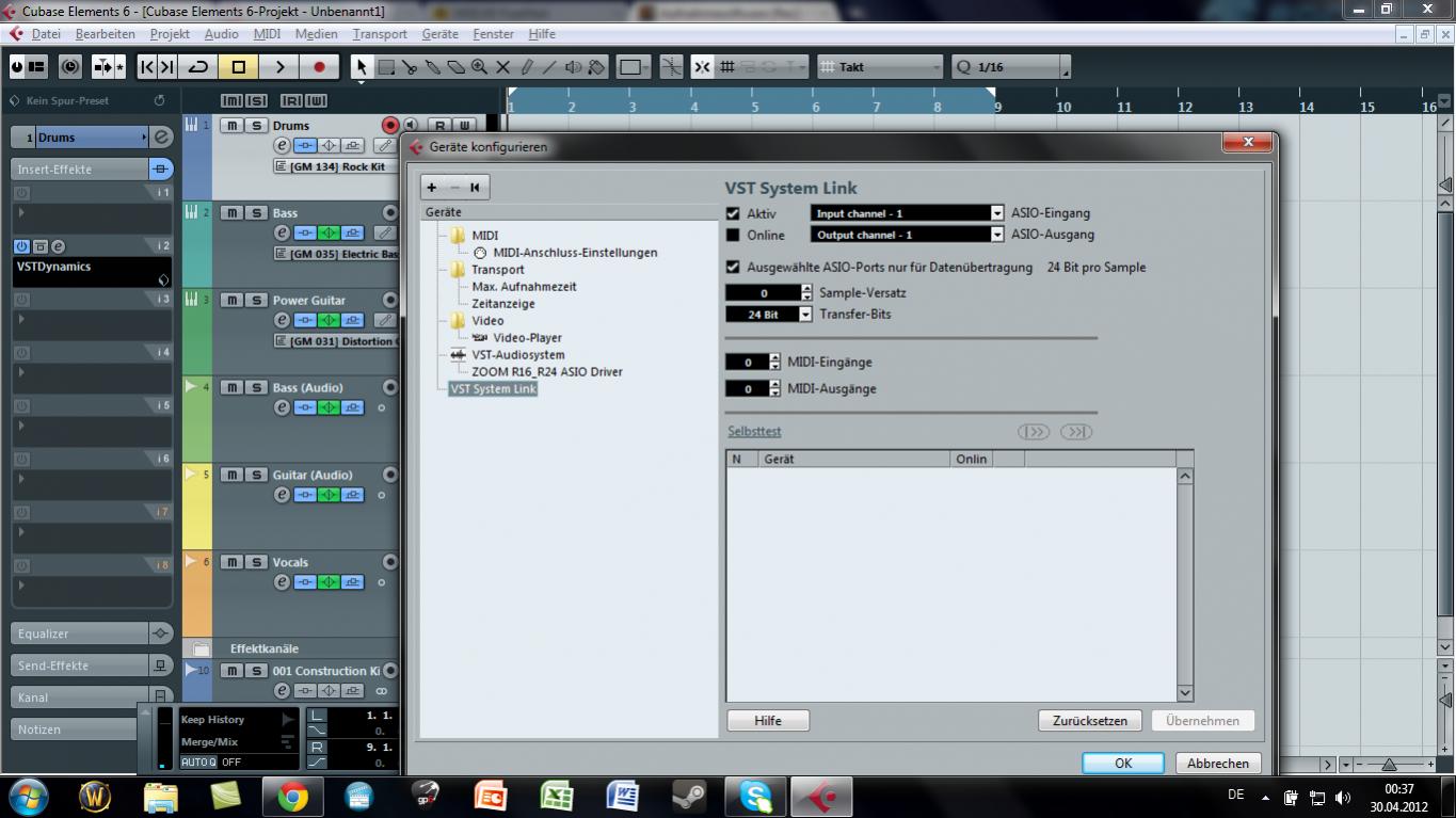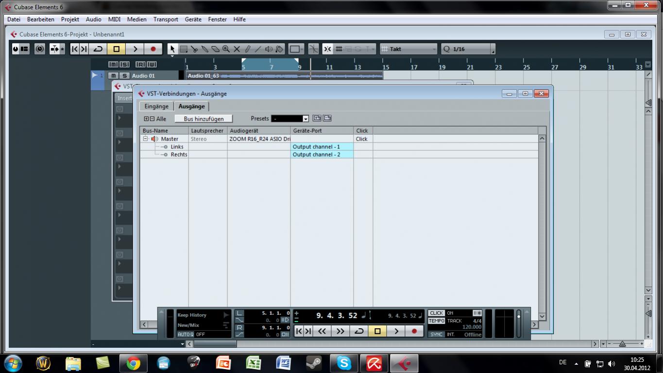 Zum Problem: Ich möchte Gitarren Tracks aufnehmen, was auch funktioniert (ich kann aufnehmen, höre, was ich spiele und hab danach einen Track). So weit so gut.. ich habe meinen Treiber richtig eingestellt und auch Ein- und Ausgänge kontrolliert. Doch wenn ich jetzt den Track abspielen will, dann höre ich rein gar nichts. Ich habe den Monitor button ausgeschaltet und habe auch einen Pegel-Ausschlag sowohl in cubase als auch am Zoom R16. Doch ein was ist mir aufgefallen.. wenn ich unter Geräte -> Geräte konfigurieren -> VST System-Link gehe und den AISO Ein- und Ausgang bestimme und den Selbstest mache, dann kommt 0 Signal durch. Übrigens.. ich habe auch keinen Sound wenn ich mir midi Beispiele anhören will..