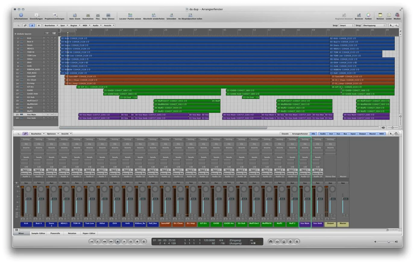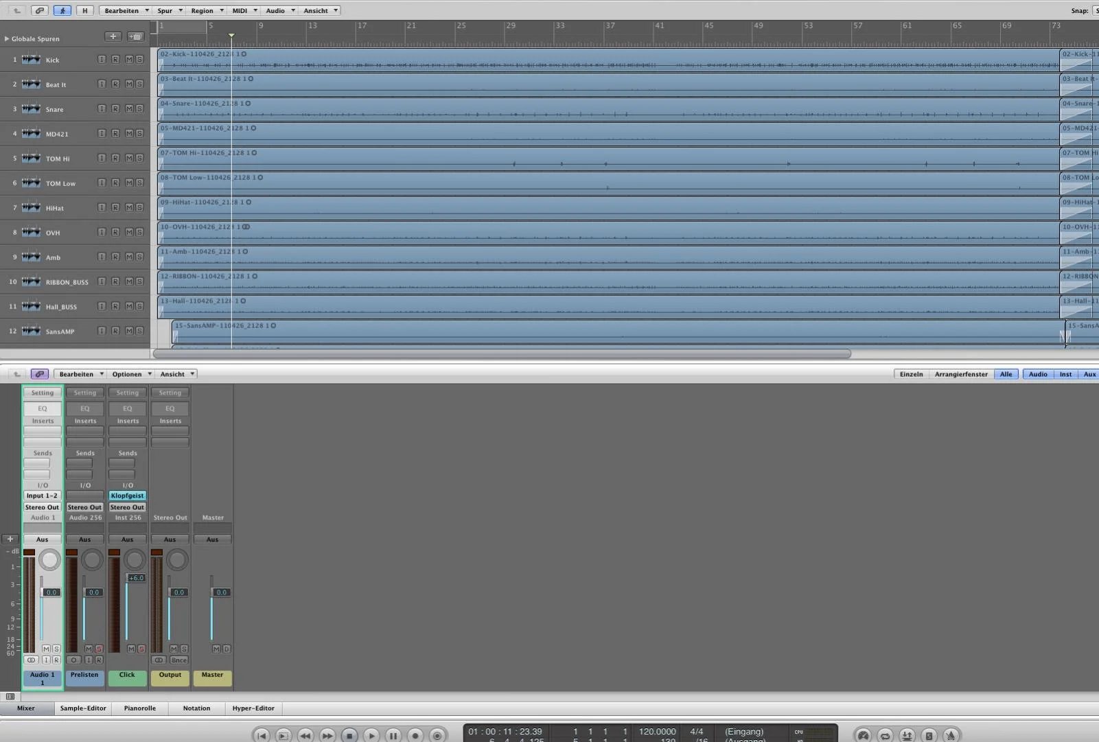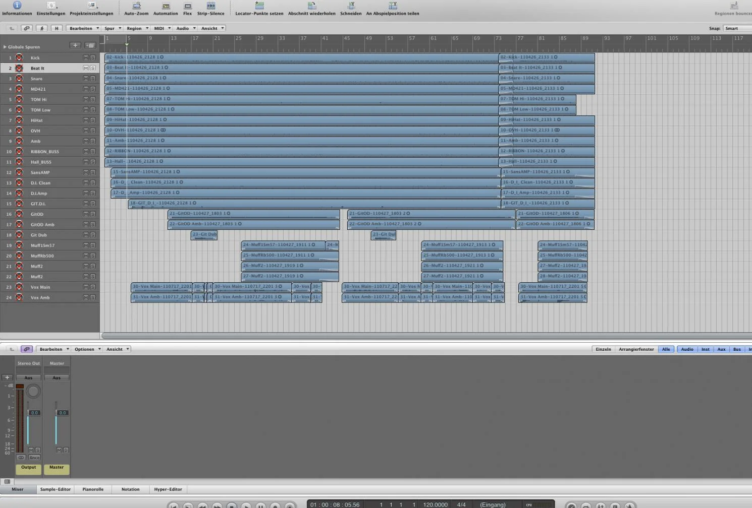Die Tracks hat er alle schön importiert, aber im Mixer existiert nur eine Spur, nämlich die, die man bei Logic anlegen muss, wenn man ein neues Projekt öffnet.