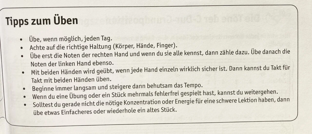 In meinem Fall war es dann halt das Unterricht Pensum einhalten und die darin besprochenen Übungen und Stücke zu vertiefen.