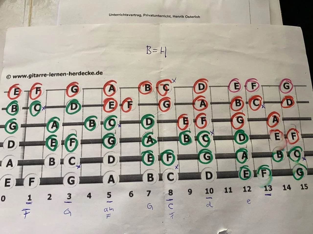 Tonleitern, Arpeggien und Pulloff-Läufe geübt (3 Tone per string) und so bahne ich mir meinen Weg durch die Landschaft der Noten und Melodien.