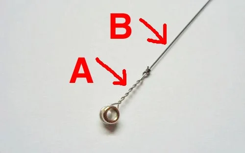 - Wo genau kappt ihr das Ball-End? Beziehungsweise wo genau klemmt ihr die Saite: Dort wo sie komplett blank ist (B)? Oder dort wo noch ein bisschen von der Ball-End-Wicklung drauf ist (A)? Siehe Bild.