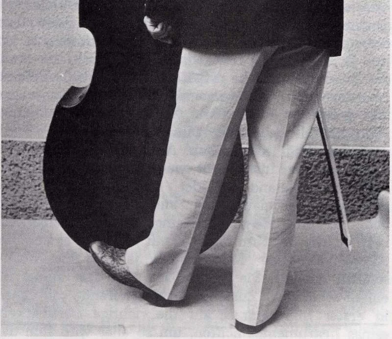 Die Höhe ist mittels des Stachels so einzustellen, daß sich der Sattel in Augenhöhe befindet. Das Körpergewicht wird auf das rechte Bein verlegt, der linke Fuß einen Halbschritt nach vorne gesetzt, das Instrument leicht gegen den Körper geneigterweise an linkes Knie und Lende gelehnt. Man spielt in möglichst aufrechter Haltung und beugt sich selbst in Mittellagen nicht sehr über das Instrument.