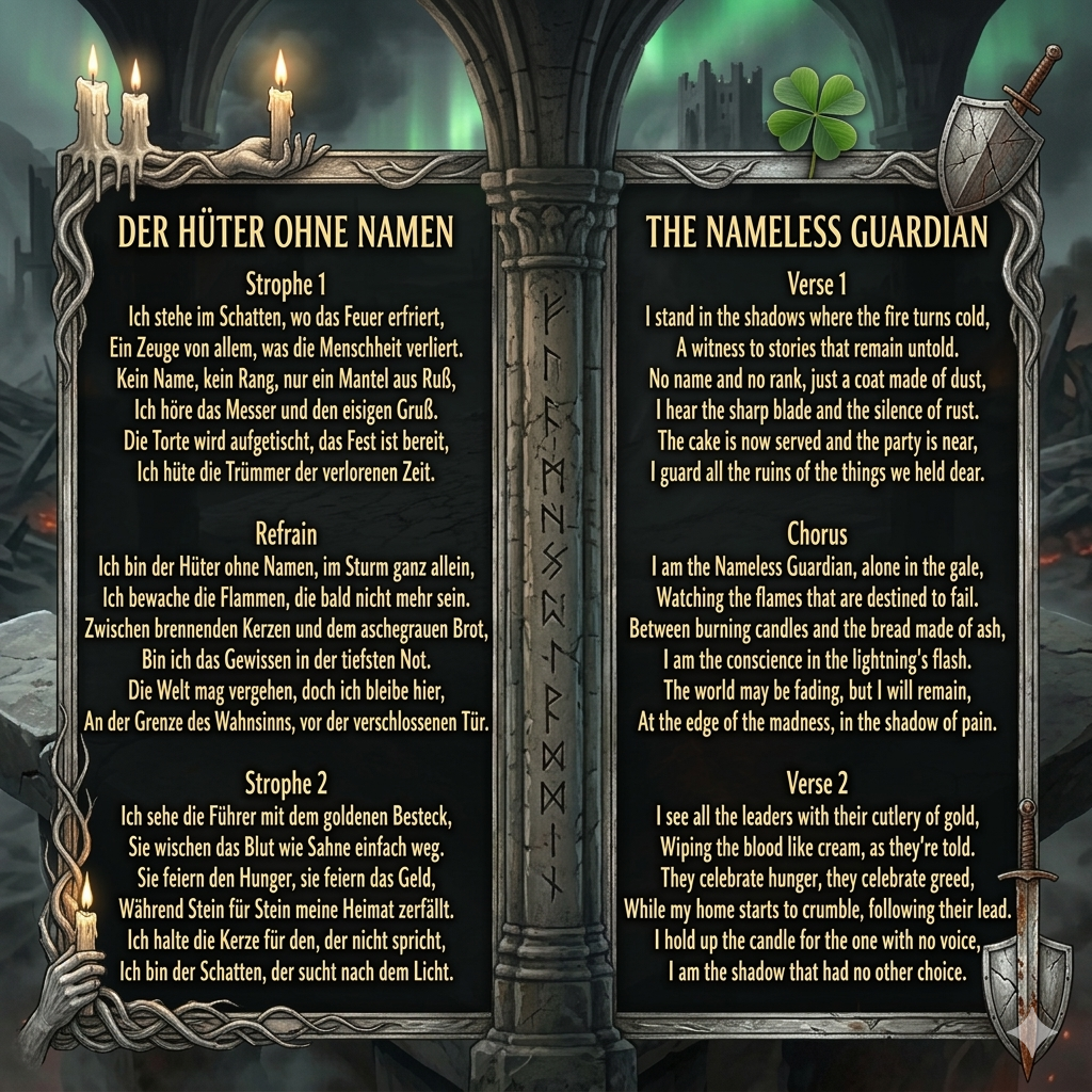 This is a conceptual project about war, using the metaphor of a „birthday feast“ where greed takes center stage. It features epic atmosphere and unique visual mythology. The lyrics shown are conceptual; the original lyrics remain protected. Musical realization is created with AI support (Suno) to match my poetic vision.