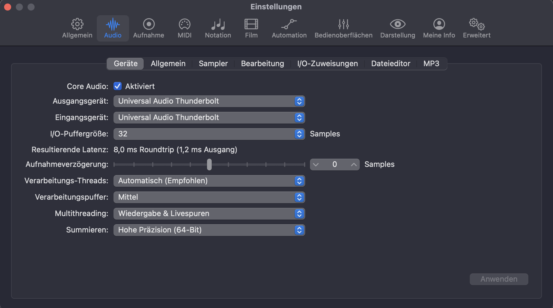 Ich spiele über ein Kawai ES-8, das per USB direkt am MacBook Pro M4 angeschlossen ist. Als Audiointerface verwende ich ein Universal Audio Apollo UAD 2 (das erste große Modell mit Thunderbolt-Karte). Mein gesamtes Setup habe ich bereits erneuert – nur das Apollo ist geblieben. Ich vermute, dass das Interface eventuell die Ursache ist, da ich egal was ich mache, nie ein wirklich spielbares Ergebnis bekomme.