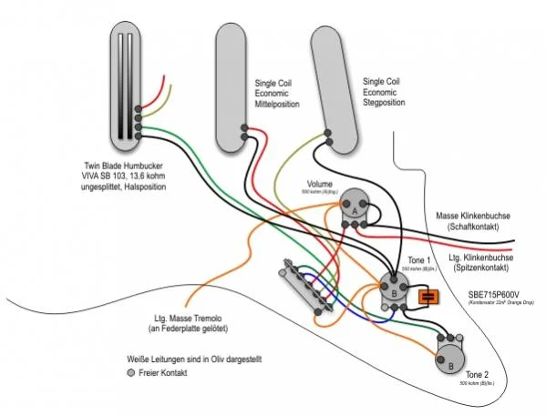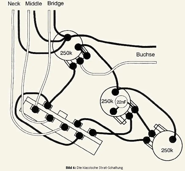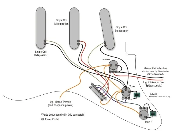 Die 3 Pickups sind Wilkinson Vintage Sound und unter den Potis und dem 5-Wege-Schalter