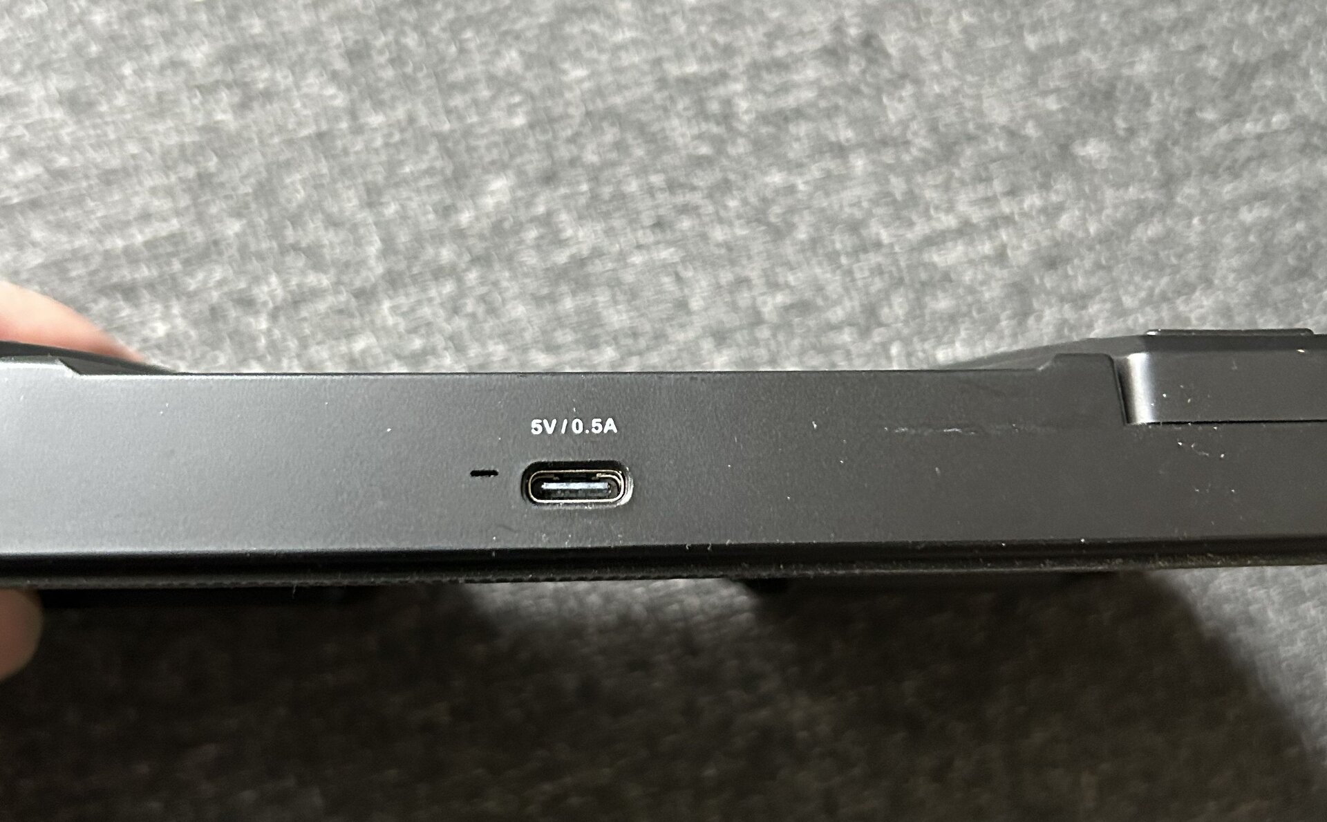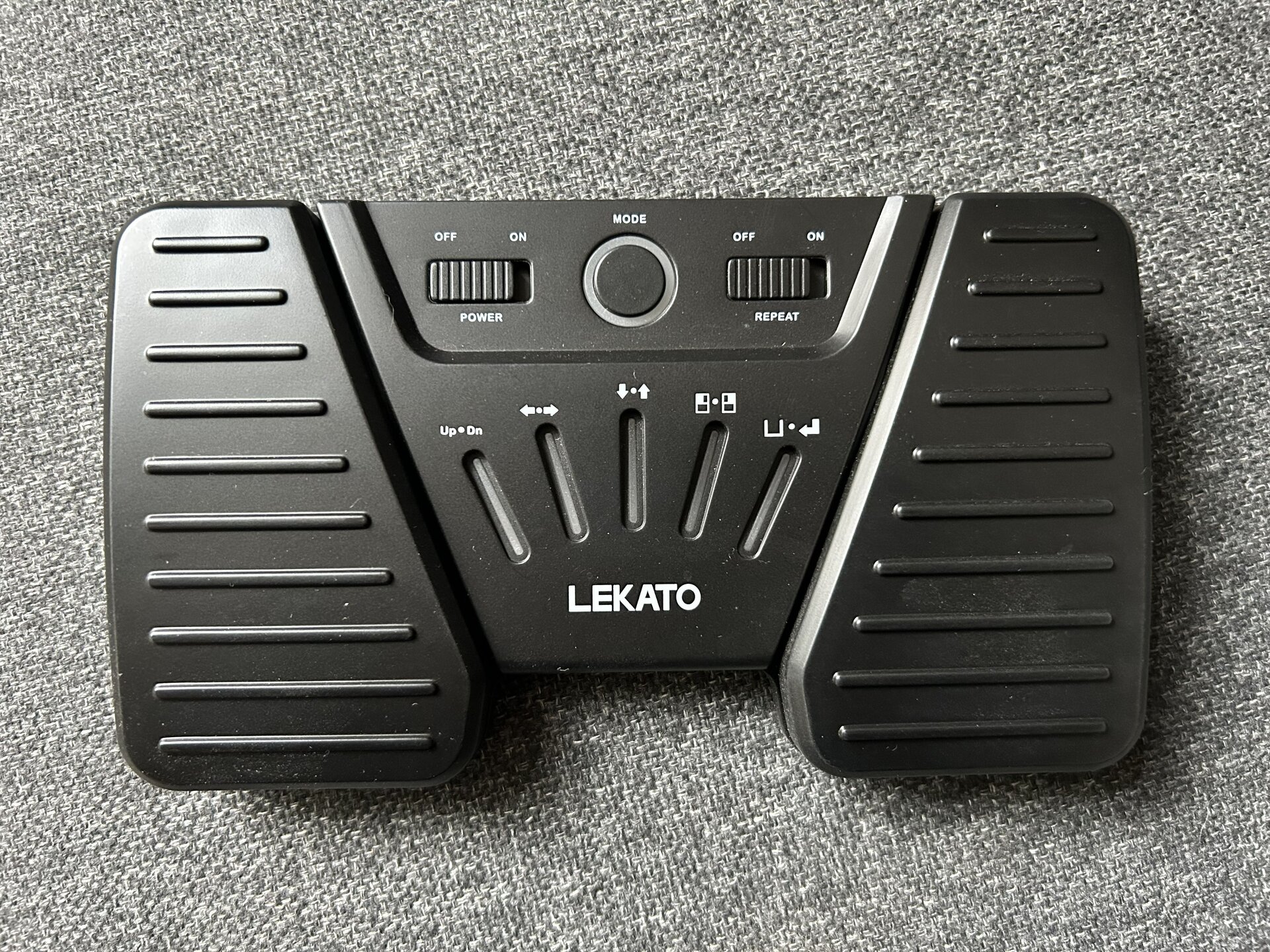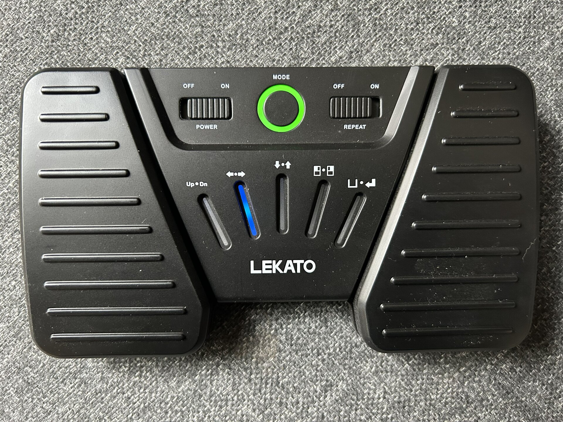 Das Gehäuse ist aus Kunststoff, macht aber einen stabilen Eindruck, wiegt knapp 300g und steht durch die Gummistreifen auf der Rückseite relativ rutschfest, ob auf dem Boden oder auch auf dem Keyboard, denn mit den Maßen von 17x10cm passte es auch auf die meisten Keyboards, falls man es lieber mit den Händen bedienen möchte. Neben den beiden Haupt-Tastern für die Bedienung, gibt es einen Schiebeschalter für Power on/off, einen weiteren Schiebeschalter für Repeat on/off, der sich mir noch nicht erschließt, sowie einen runden beleuchteten Mode-Taster, mit dem man zwischen 5 Modi wechseln kann. Die beiden Taster lassen sich genauso mit den Füßen wie mit den Händen bedienen. Offensichtlich erfolgt die Strom-Versorgung über einen internen Akku, der über einen USB-C Anschluss geladen wird.