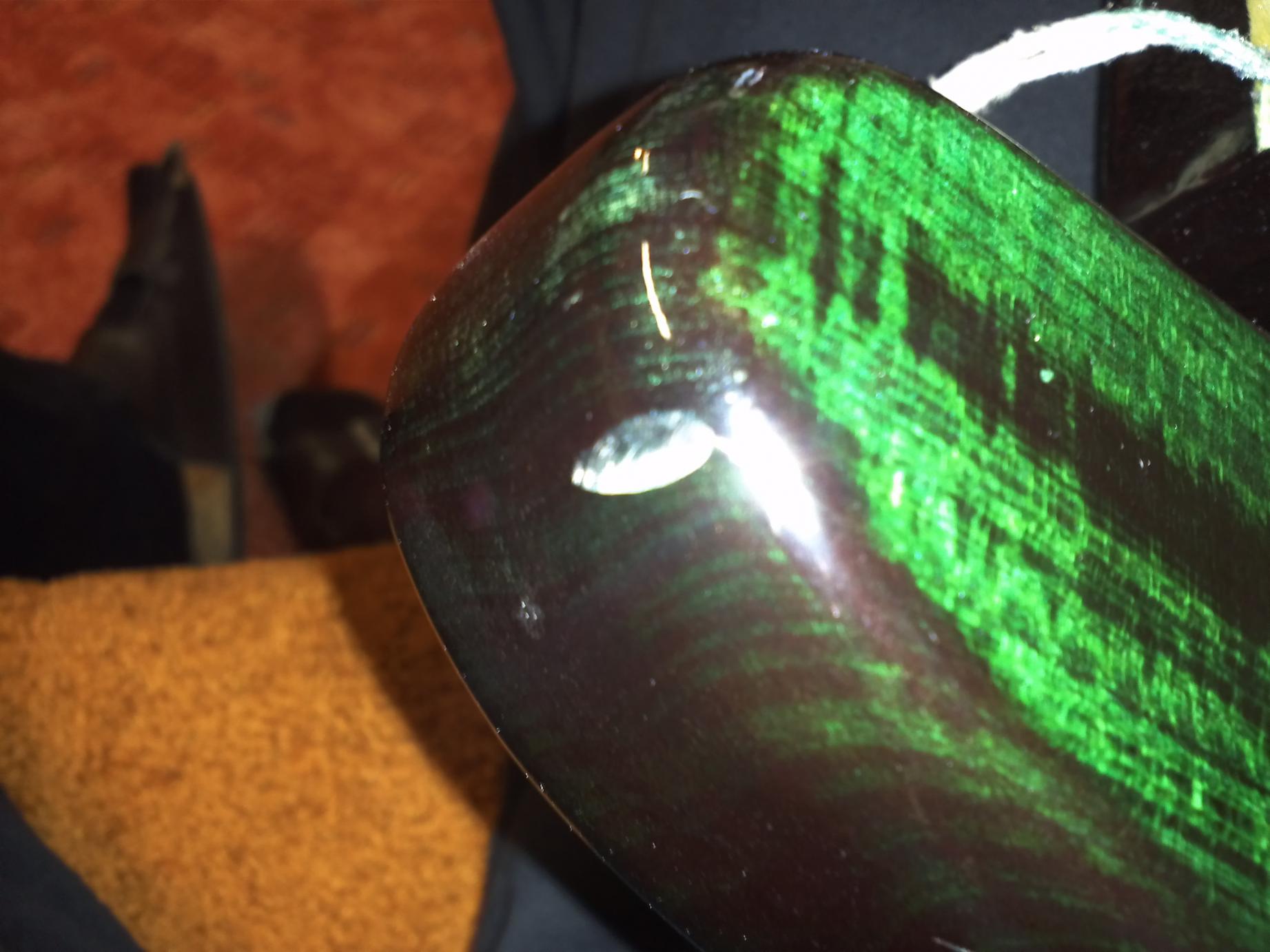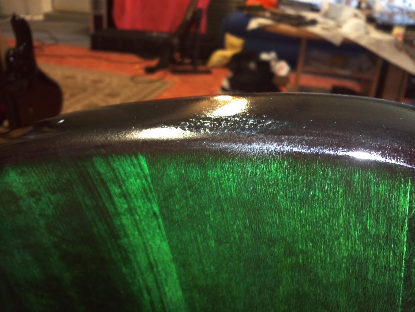 Ich habe vor dem Beizen geschliffen, und dabei habe ich an einem kleinen Stück am Rand zu viel weggeschliffen, da ich nicht wusste dass die Ahorndecke auf Grund der Wölbung dort so dünn ausfällt und jetzt habe ich dort Risse, die zum Abblättern der Ahorndecke führen.