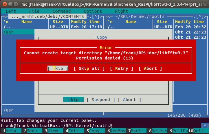 Das ist ein Dateimanager fürs Terminal. Mit dem navigieren wir auf der einen Seite zu dem Ort, an dem die *deb liegen, mit der anderen Seite zum rootfs. Für jedes *deb wechseln wir nun in die Datei (genauso wie in ein Verzeichnis) und kopieren den Inhalt von 'CONTENTS' ins rootfs (Kopieren = F5 auf der Tastatur). Dabei bitte darauf achten nur solche Dateien zu ersetzen, die im rootfs die Größe 0 haben. Jetzt sind die Bibliotheken vollständig und wir beenden MC mit ESC-0 (Escape-NULL, also nacheinander drücken) und drücken Ctrl-D um den Root-Modus zu verlassen.