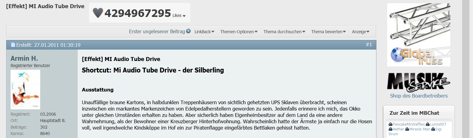 Mich ärgert einfach, dass Einige (und nicht manche, sondern sehr viele!) lediglich ein paar Sätze schreiben, dadurch auf irrsinnig viele Beiträge in kurzer Zeit kommen und sich mit ihrem abgeschriebenen Halbwissen, warme-Luft-Gelaber und tollen Albenfotos Punkte verdienen, obwohl nichts dahintersteckt! Nach außen sieht es für mich dann aber aus, als steckt da ein Bescheidwisser hinter dem Profil, weil eben viele Bewertungen da sind.