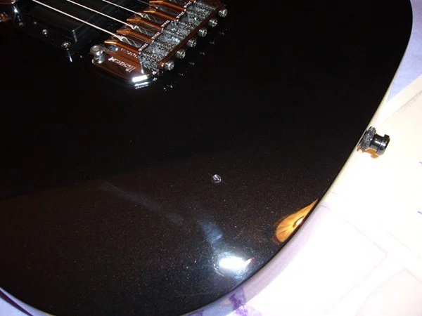 😡), ist ein Ende des Klinkensteckers vom Instrumentenkabel in den Gitarrenkorpus geraten und dadurch habe ich jetzt ein unschönes kleines Loch im Lack (siehe Bilder). Das kann auch nur mir passieren und ich hätte jetzt gedacht ein Lack hält etwas mehr aus. Gegen die gängigen Kratzer habe ich auch nie Einwände gehabt, weil die nun mal an den Lack kommen, aber ein Loch eben nicht. 😡