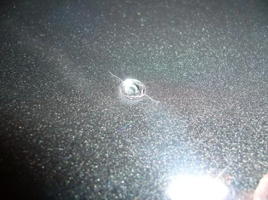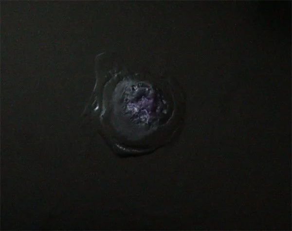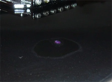 Sekundenkleber nach dem Trocknen (Loch4). Nach dem Schleifen habe ich die Schleifpolitur von Clover mehrmals benutzt. Es ist noch eine kleine Unebenheit zu sehen und es ist irgendwie ein kleiner heller Ring darum entstanden (Loch5), keine Ahnung wo der her kommt. Scheint vielleicht Feuchtigkeit vom Polieren zu sein. Durch das Blitzlicht der Kamera sieht das natürlich noch viel undefinierter aus (siehe dieses Pink, wo eigentlich kein Pink ist