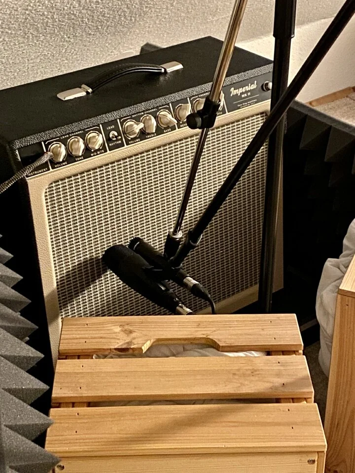 Die beiden Mikrofone habe ich aktuell sehr nah beieinander positioniert, etwas links von der Karlotte des Amps.