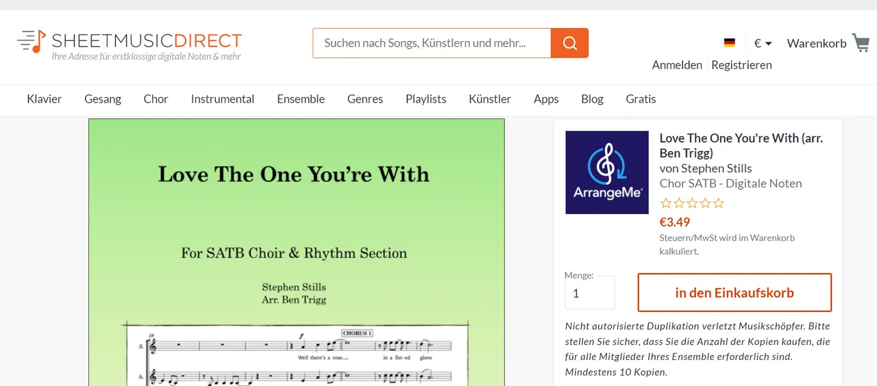 Ich suche einen (vier-?) -stimmigen Satz vom genannten Stück (CSN&Y). Wenn ich nach "Choral Score" oder "Chorsatz" oder "Score" suche, wird mir zuhauf diese blöde MuseScore Seite angezeigt oder Ultimate Guitar, jedenfalls nichts wo ich wenigstens einen kleinen Einblick haben kann, ob es überhaupt ein mehrstimmiger Satz ist oder wo es eben nur die Akkorde und die Melodie gibt.