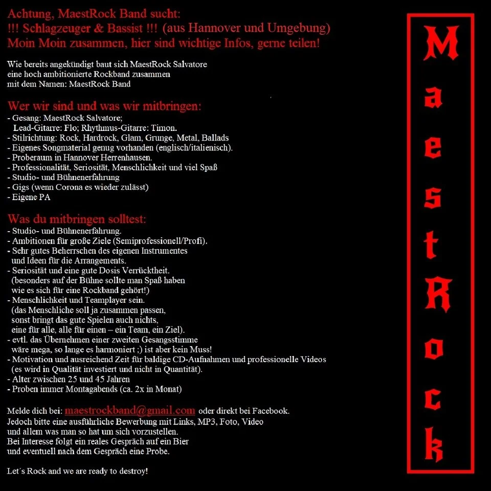 Melde dich hier oder bei: maestrockband@gmail.com oder direkt bei Facebook.
