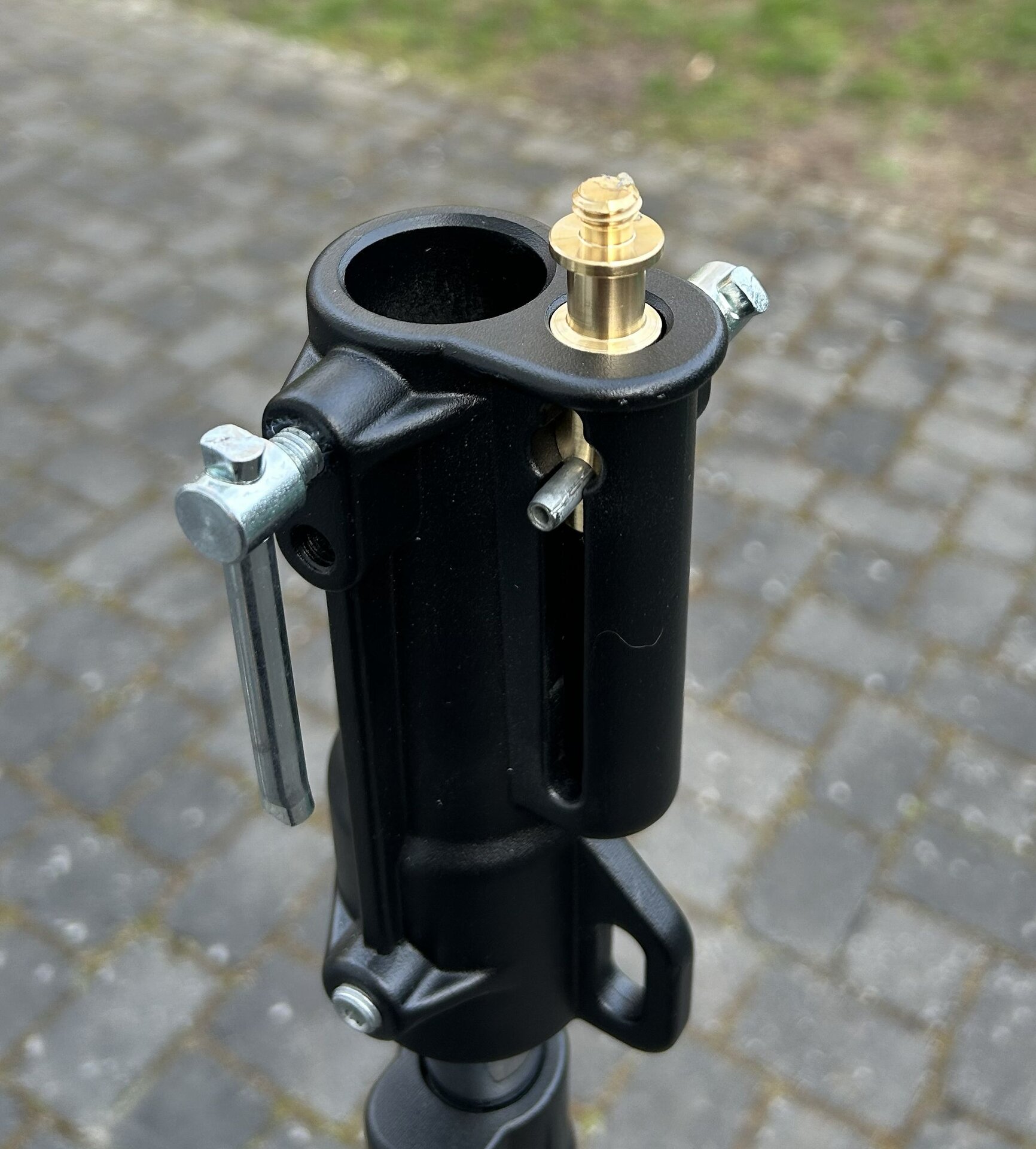 Eine Ergänzung zum Stativ musste ich mir aber noch besorgen, da die Traversen eine 35mm Boxenflansch-Aufnahme haben, das Manfrotto aber nur eine 28 mm Zapfenaufnahme sowie einen 16 mm Zapfen mit 3/8" Außengewinde.