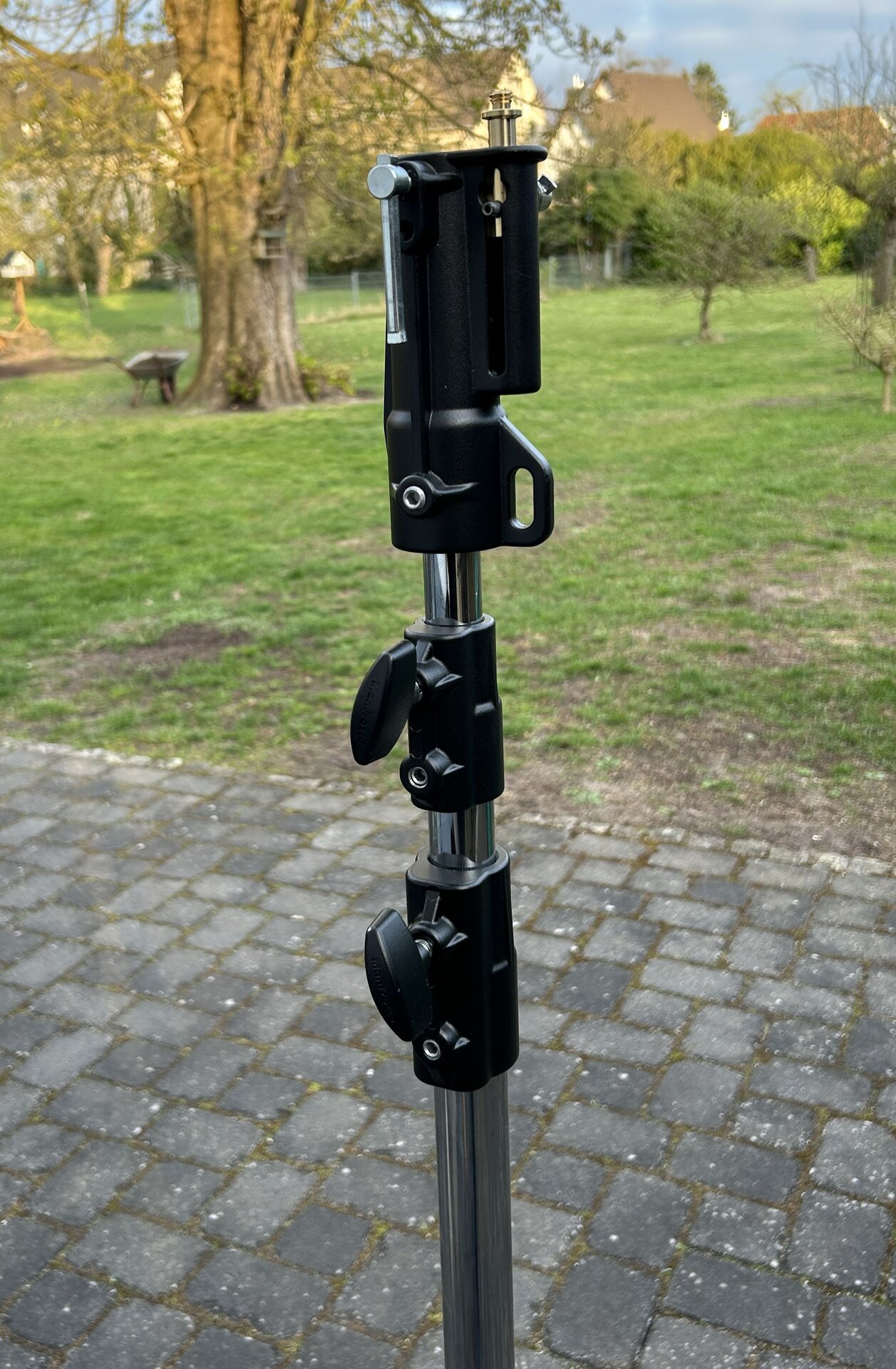 Voll ausgezogen hat das Stativ mit 3,25 m schon eine amtliche Höhe, schon mal 15 cm höher als die Stageworks, auch wenn ich die selten ausfahren würde, schon gar nicht mit den doch nicht ganz so leichten Traversen.