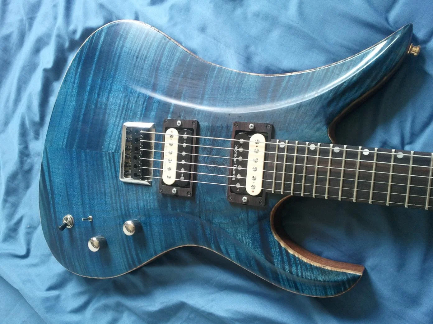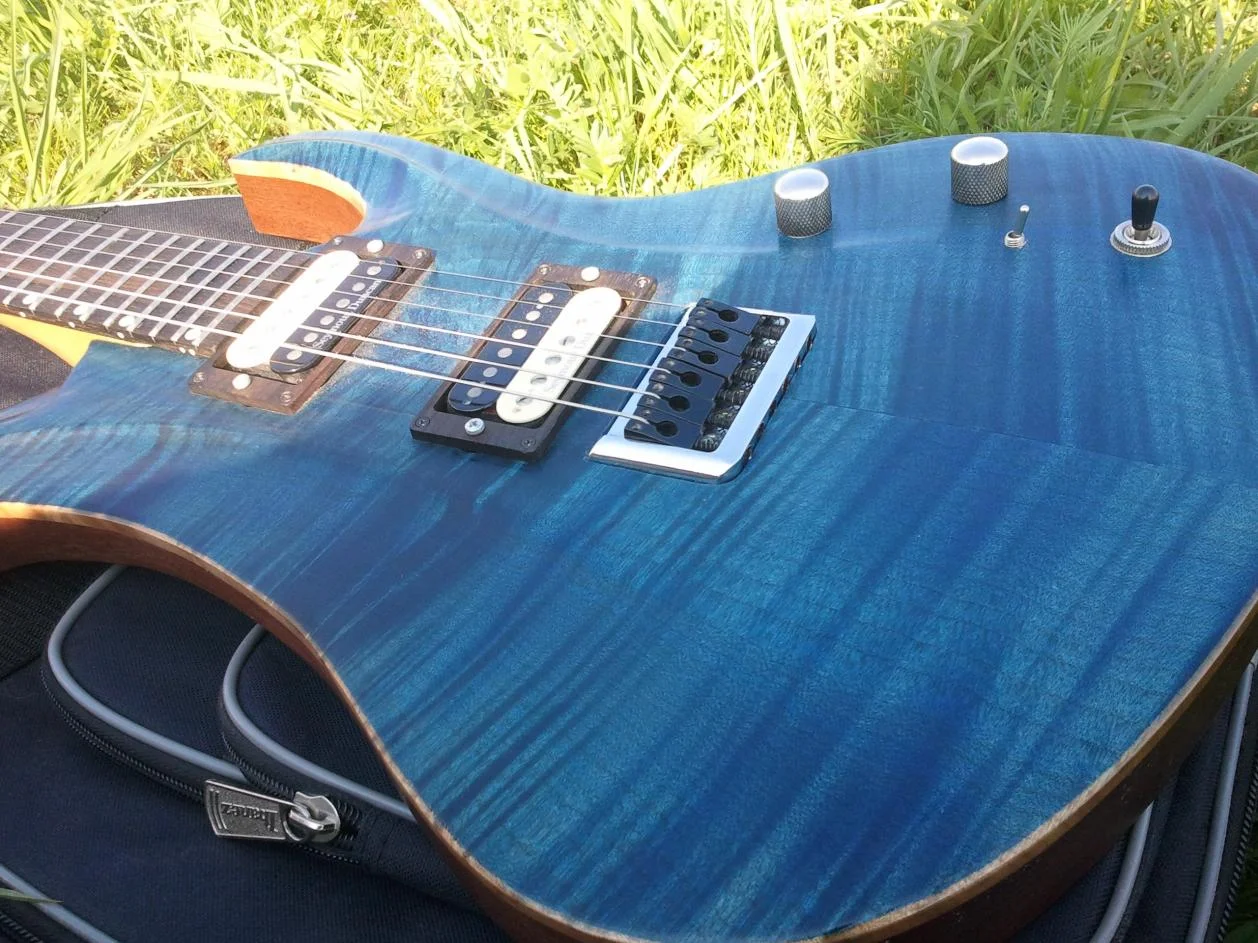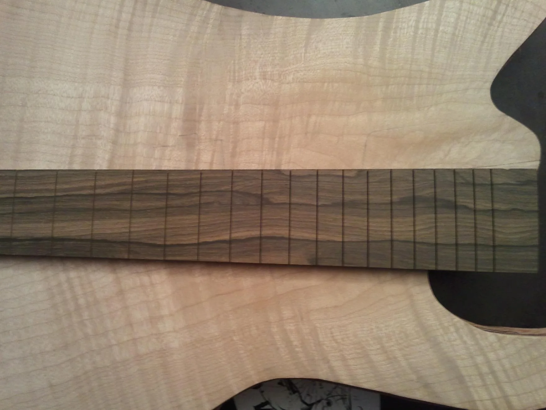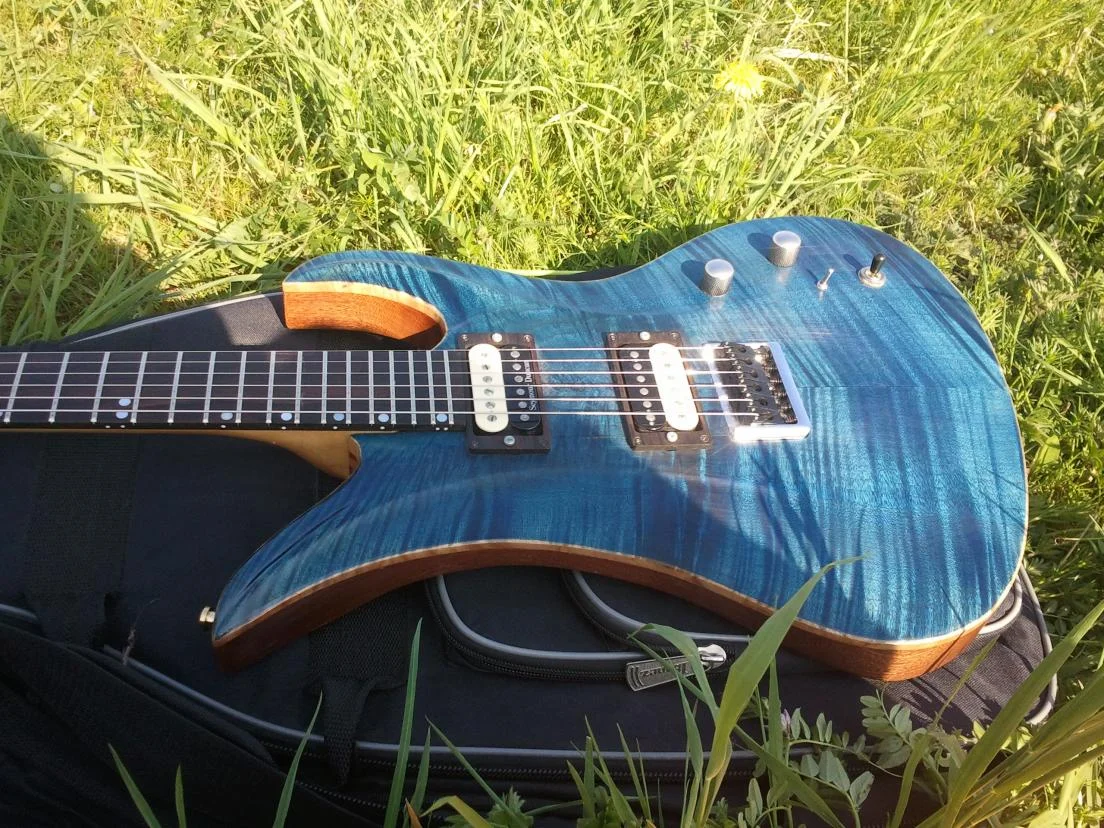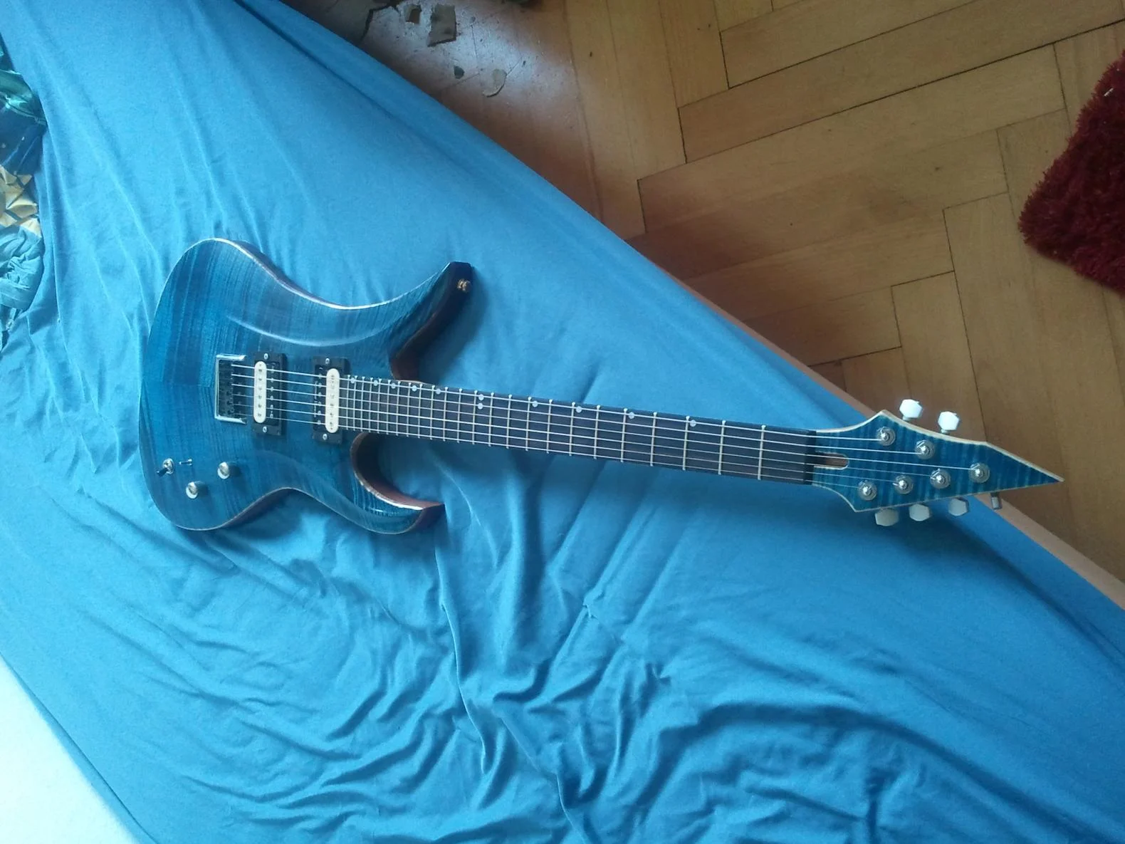 Hals: Ahorn 1 tlg, Ziricote Griffbrett, 24 Jumbo Bünde, 25,5" Mensur, Perlmutt Offset Dot Inlays, 2l 4r