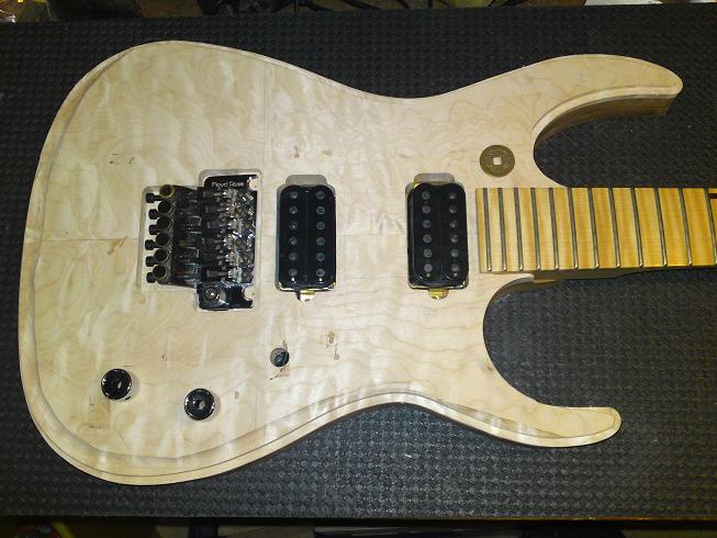 Ja ein Ahorngriffbrett so ganz nackisch sieht schon auch fein aus! Da hab ich mir die Streifen eingebildet. Ich wollt schon immer mal ein Inlay, dass über 3 Bünde geht und trotzdem schlicht ist. Was käme da besser in Frage als zwei olle Streifen. ^^