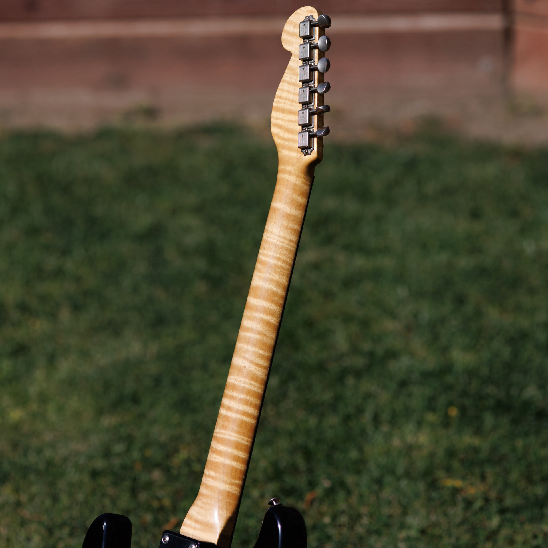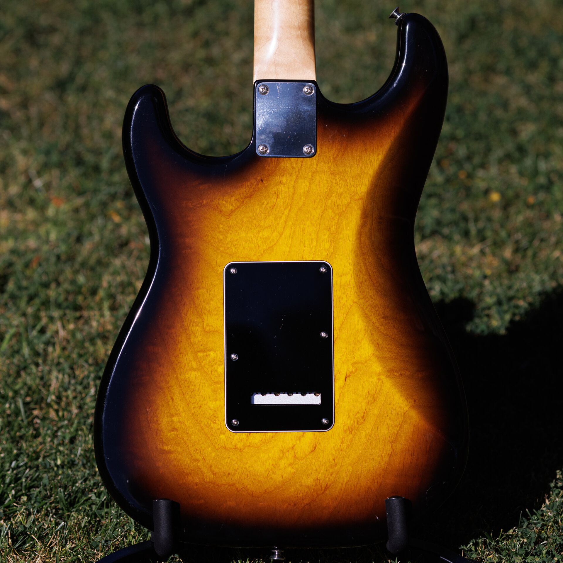 Mit Mahagoni Body und Wölkchen-Ahorn Decke, nicht die typische Strat-Kombi, aber was ist schon Tonholz? Wer hier beim Sound das Mahagoni hört, ohne es zu wissen, bekommt ein Eis! Im Zusammenspiel klingt das Teil einfach sehr klar, transparent und auch vielschichtig.