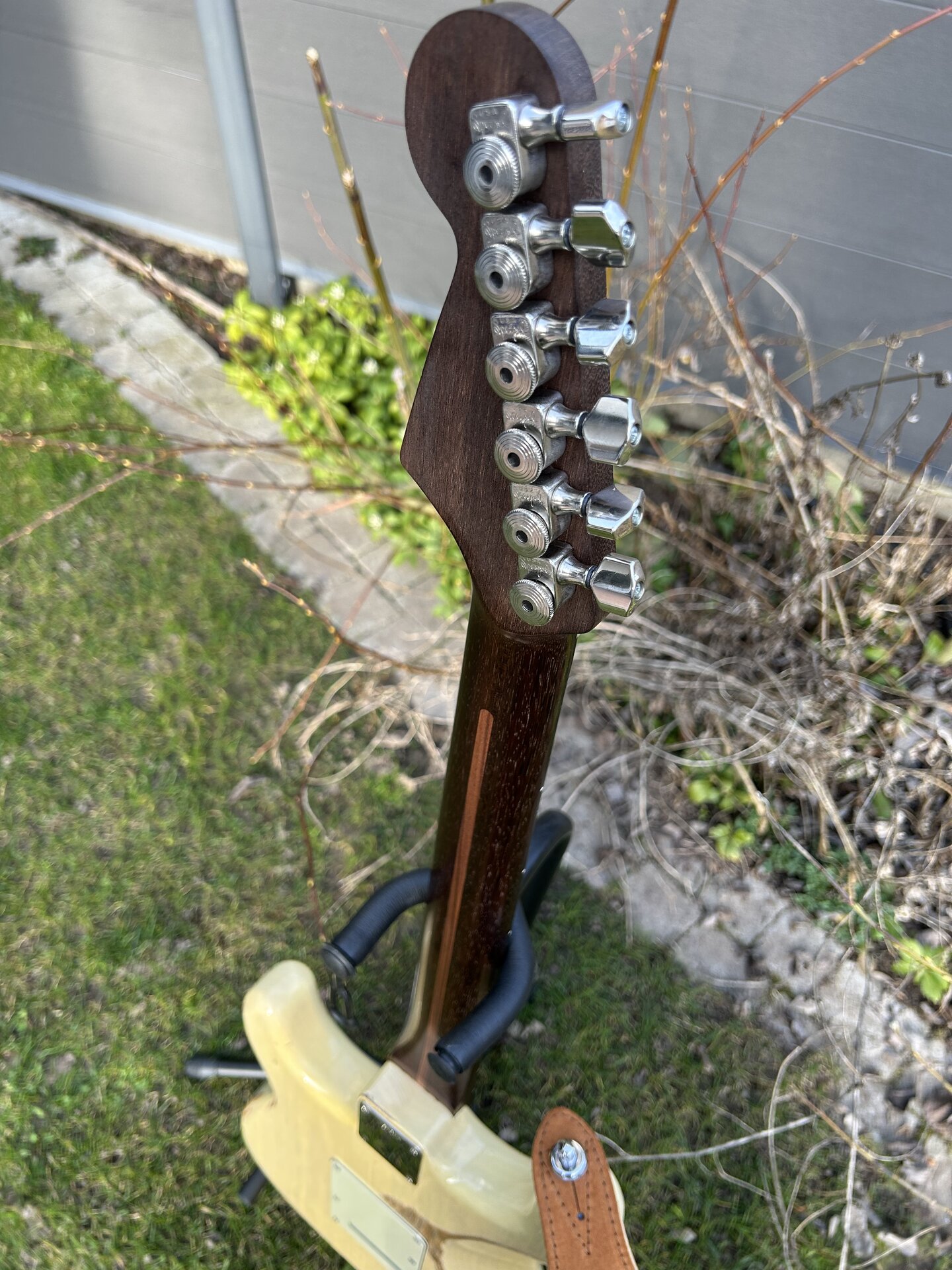 HSS PU (da noch OBLs), Freudlos Trem inkl. Unterfräsung, Kahler Locking System an der Kopfplatte, neuer Hals mit abgeschrägter (