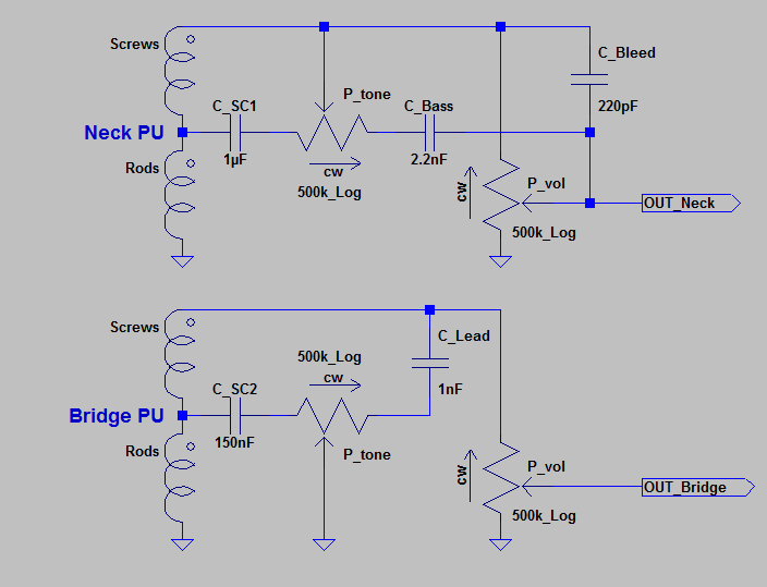 Beim Hals-Tonabnehmer gibt es zunächst einen klassischen Treble-Bleeder (C_Bleed, 220pF) am Volumen-Poti, damit beim Zurückregeln des Volume der 'Spratzel' erhalten bleibt (v.a. für den SC-Sound wichtig, besonders mit langem Kabel).