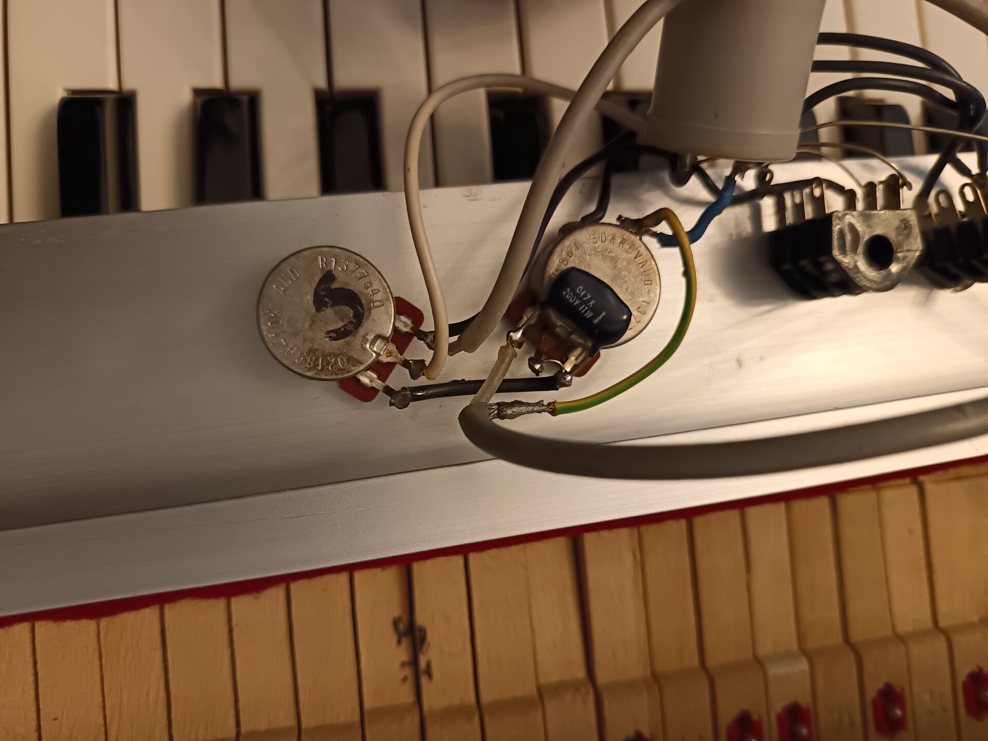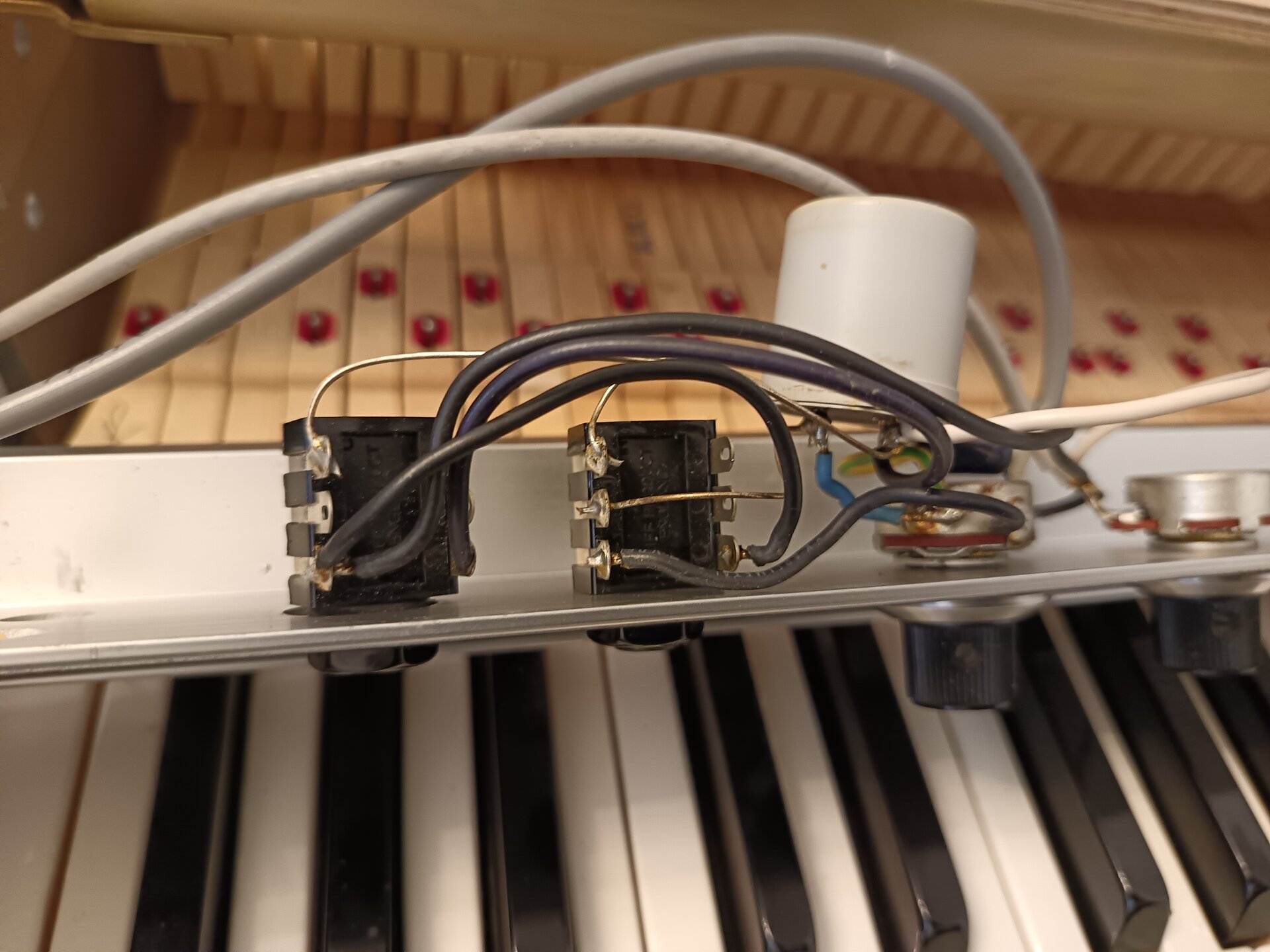 Hinter der Frontrail ist eine graue "Tonne" mit fünf Anschlüssen hinzugelötet worden und der zweite Anschluß spielt deutlich lauter als der originale.