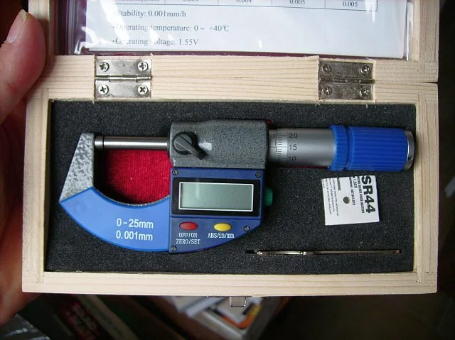 Meine (abgebildete) Mikrometerschraube ist aus China, was für die seltene Nutzung ausreicht, ein europäisches Qualitätswerkzeug gleicher Bauart würde ein mehrfaches kosten. Diese modernen Digital-Messschrauben sind im Grunde genauso aufgebaut, wie die im Wikipedia-Artikel abgebildete einfache Bügelmessschraube. Sie können daher meistens auch ohne die Digitalanzeige verwendet werden, zumal das Vorhandensein einer Digitalanzeige nichts über Qualität oder Genauigkeit eines Messinstrumentes aussagt, wie inzwischen ja jeder an den 5€ Digital-Multimetern oder -Armbanduhren sehen kann. Ob man ein durch ungenaue Messung herbeigeführtes Ergebnis hinterher digitalisiert, ändert halt nichts an diesem Ergebnis.