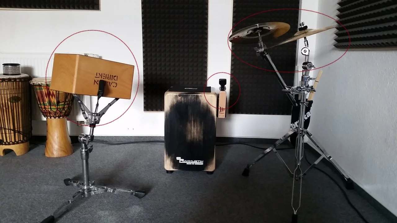 Ich nehme meine Cajon auf der Bühne über Grenzfläche Shure Beta 91A ab. Das klappt super, allerdings hat sich mein Setup jetzt vergrößert und im Moment bin ich mit der Mikrofonierung der Anbauteile unzufrieden: