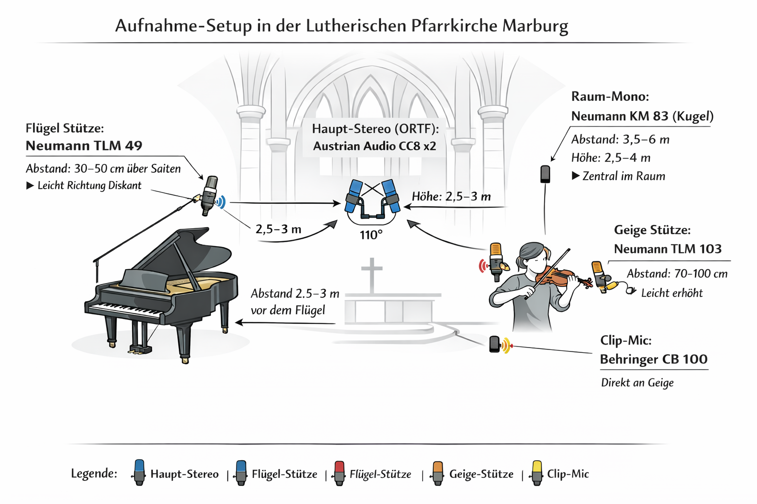 - Hauptmikrofone → liefern Raum + Orchester + etwas Klavier
