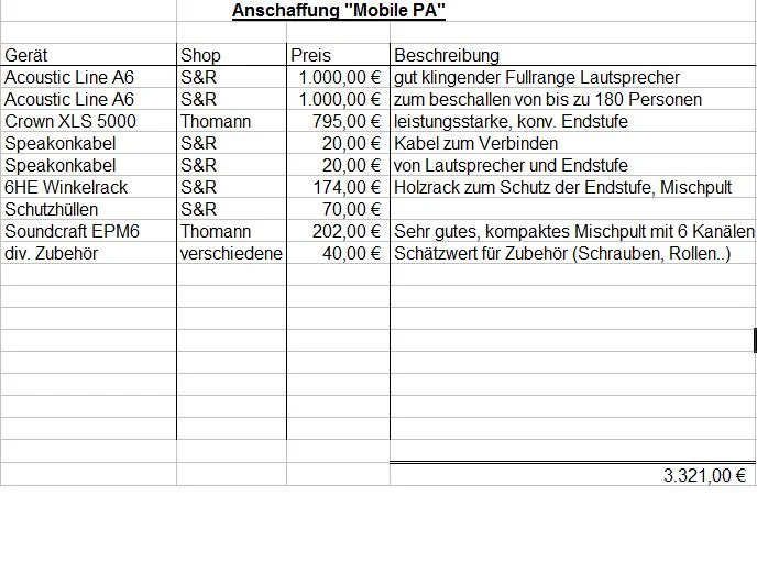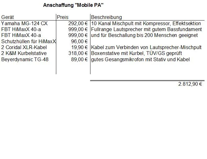 Wie gesagt die PA für Schullautstärke bei im Durschnitt 150-200 Personen. Ohne Subwoofer, denn das ist das Problem.