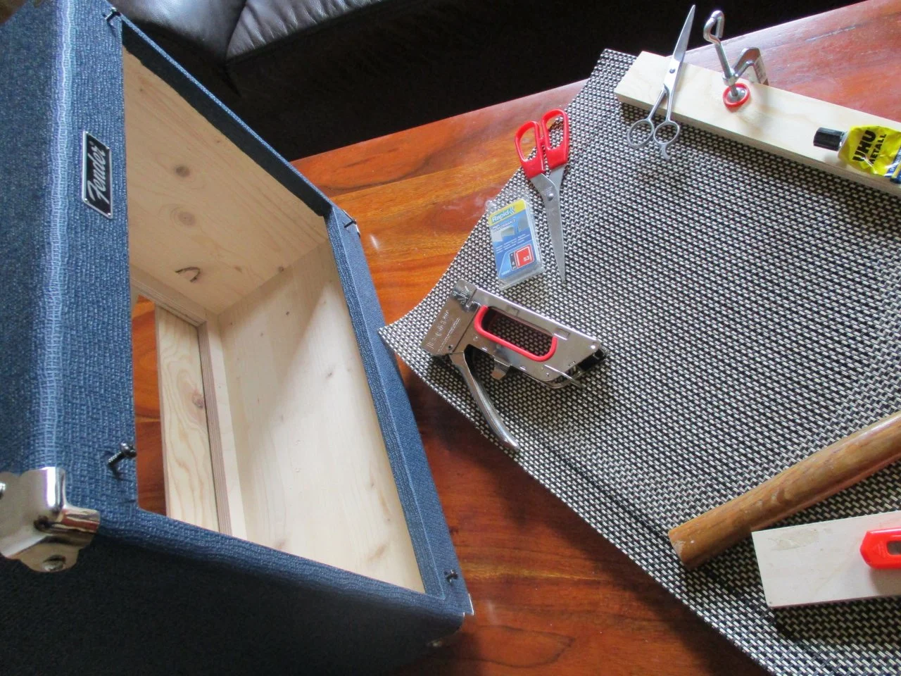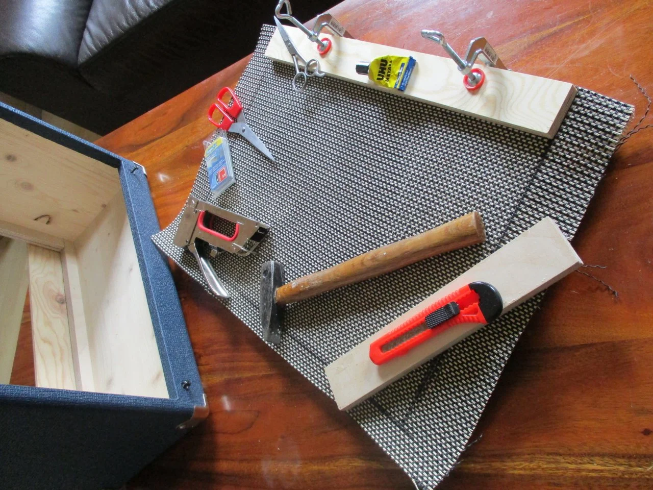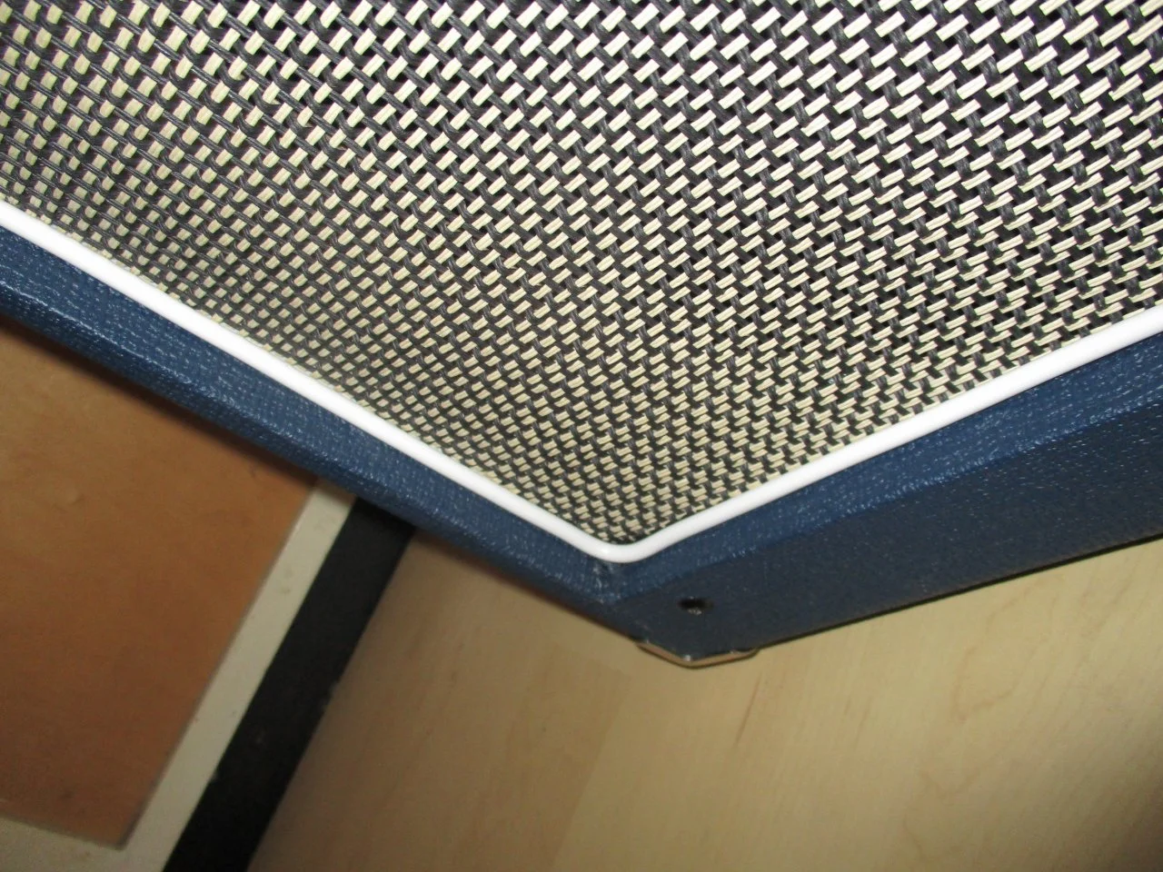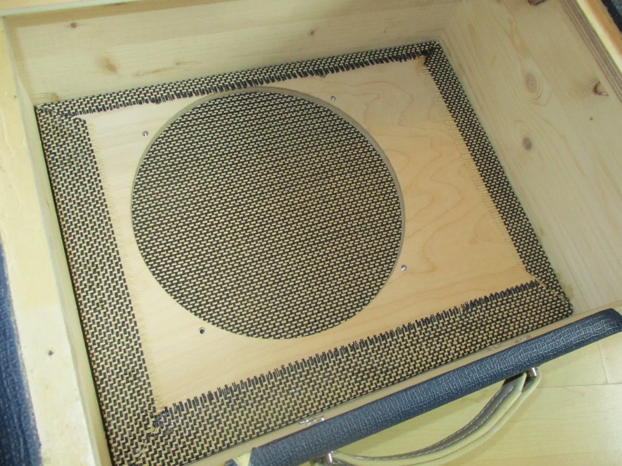...Das Korbgeflecht muss ... absolut stramm sitzen damit keine Delle bzw. kein Bauch im Material entsteht an der Speaker Öffnung. Schwierigkeit: Die Linien vom Korbgeflecht müssen dabei natürlich gerade sitzen und dürfen nicht verzogen werden....