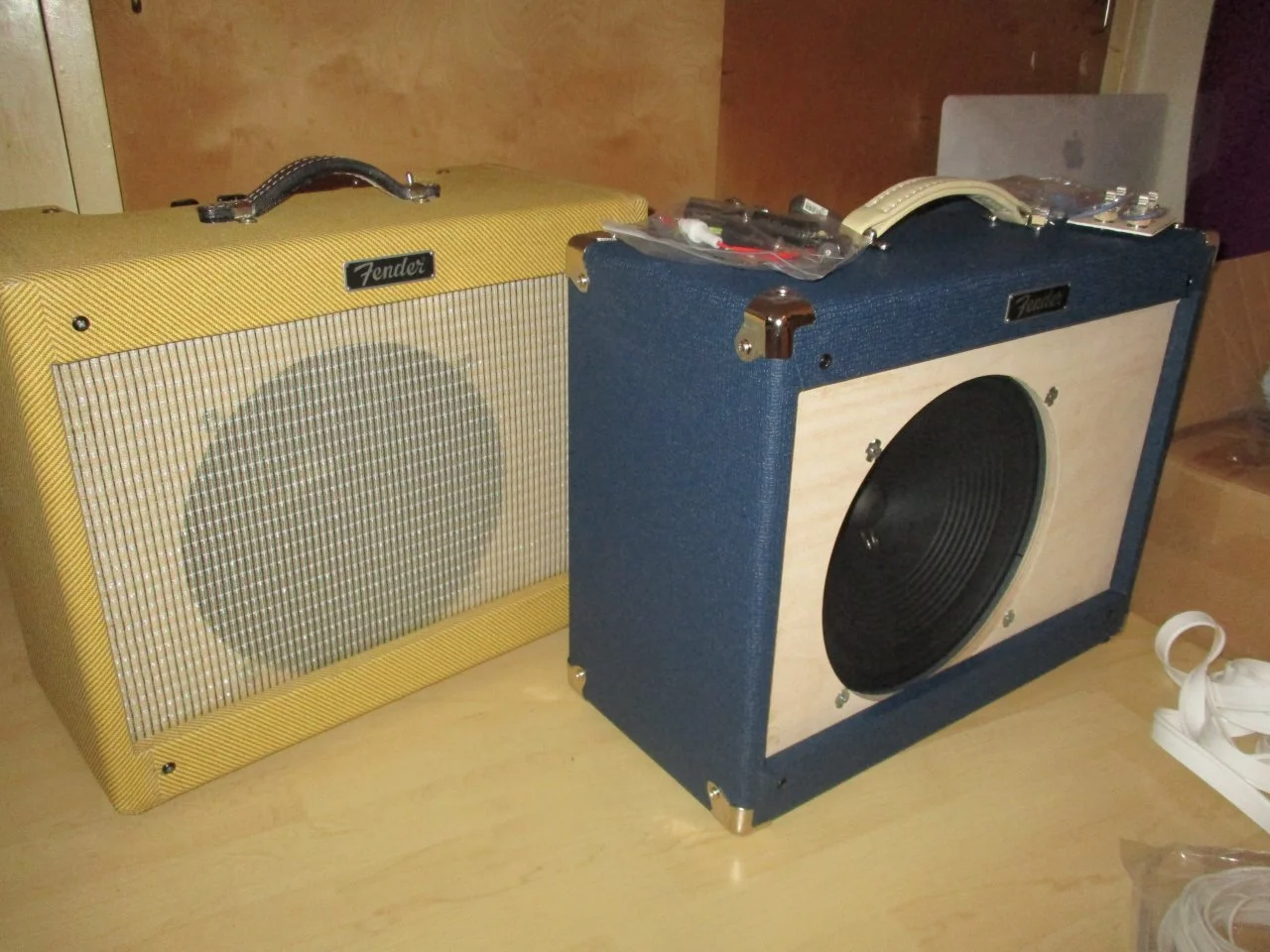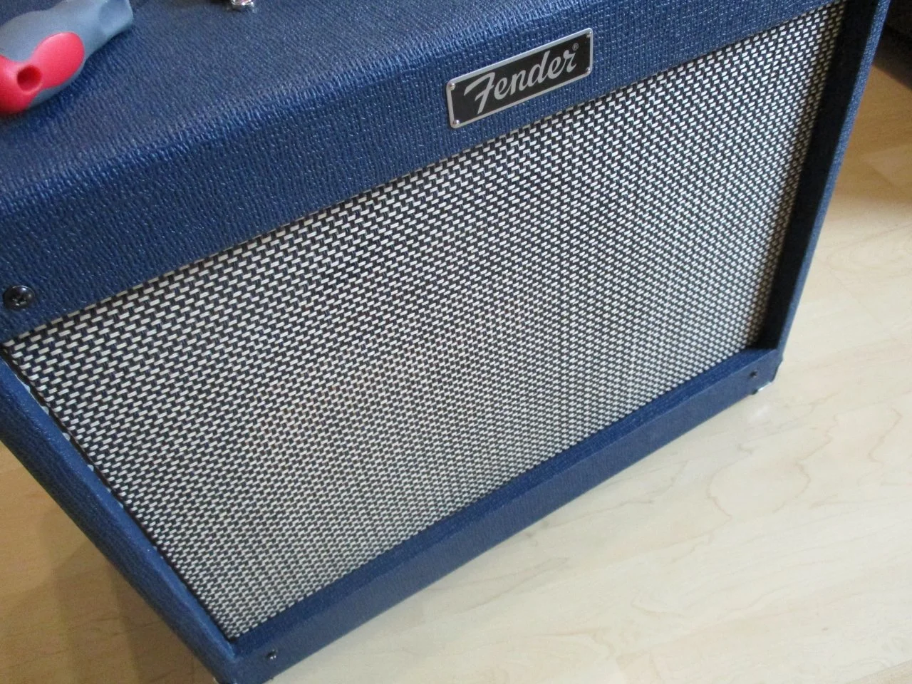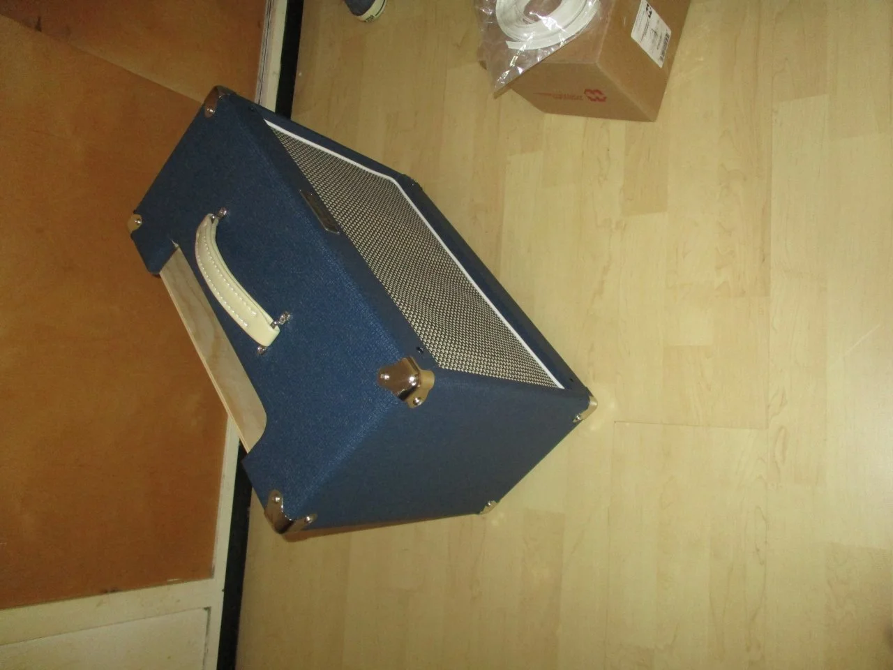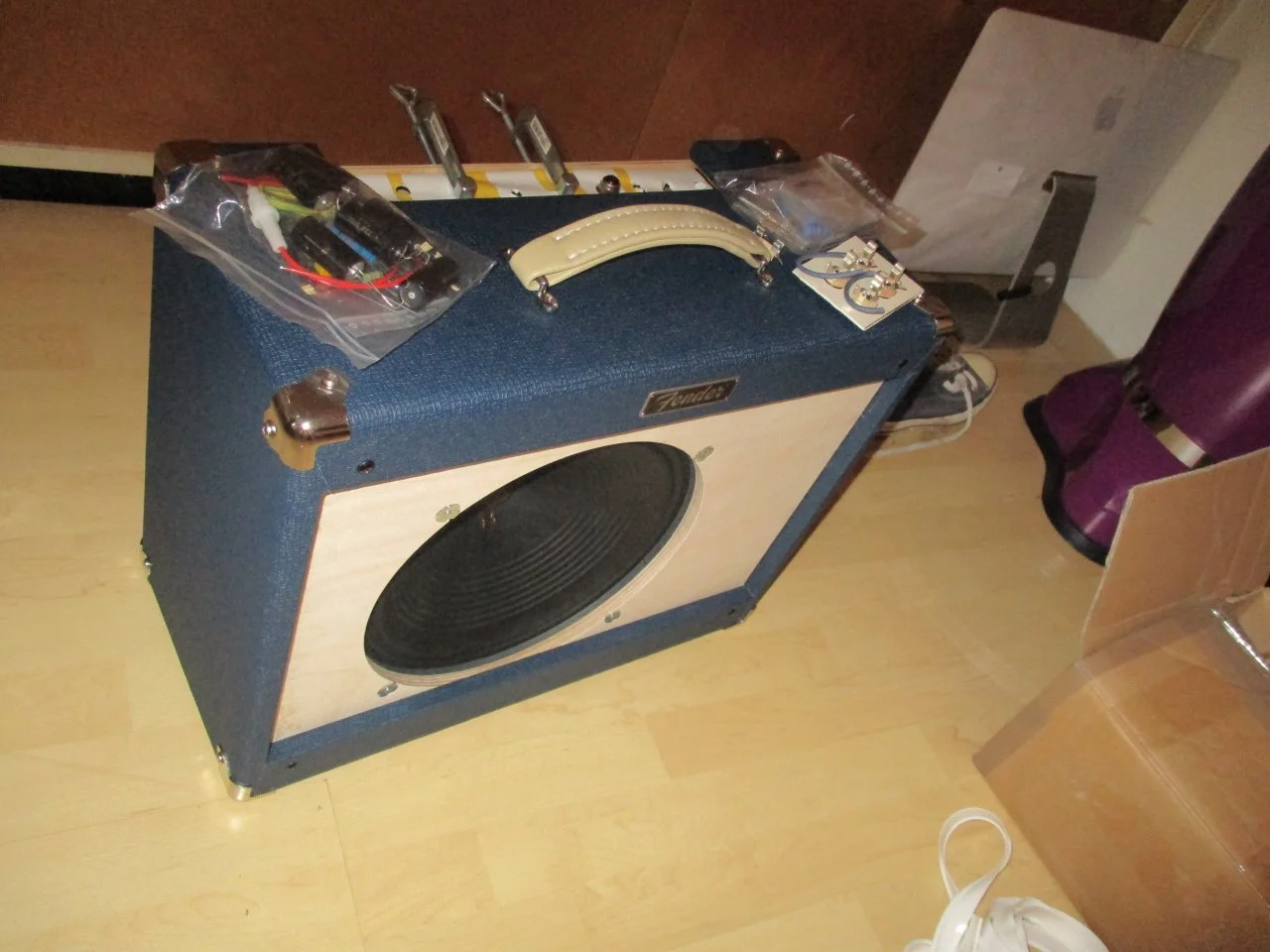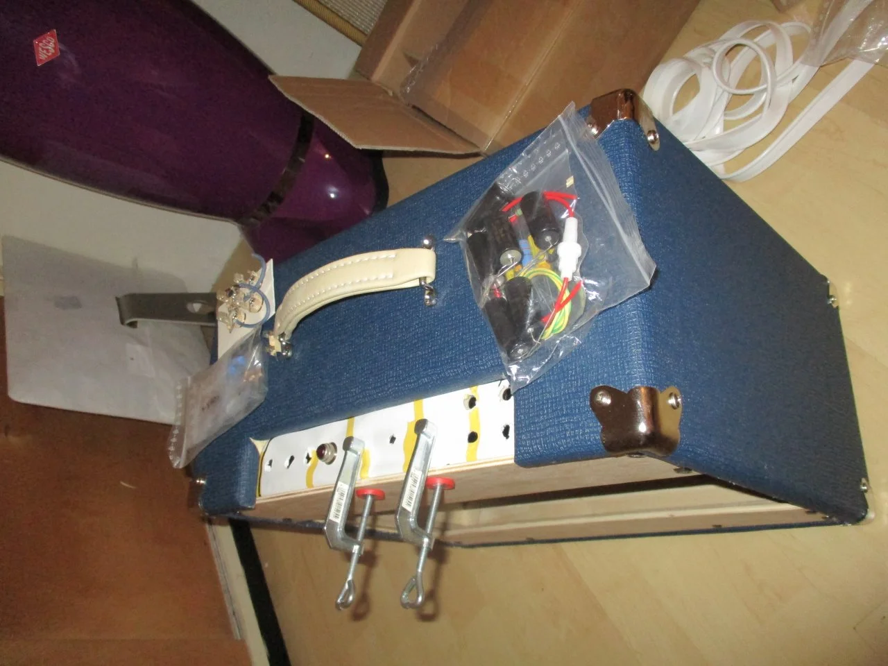 ...Das Korbgeflecht muss ... absolut stramm sitzen damit keine Delle bzw. kein Bauch im Material entsteht an der Speaker Öffnung. Schwierigkeit: Die Linien vom Korbgeflecht müssen dabei natürlich gerade sitzen und dürfen nicht verzogen werden....