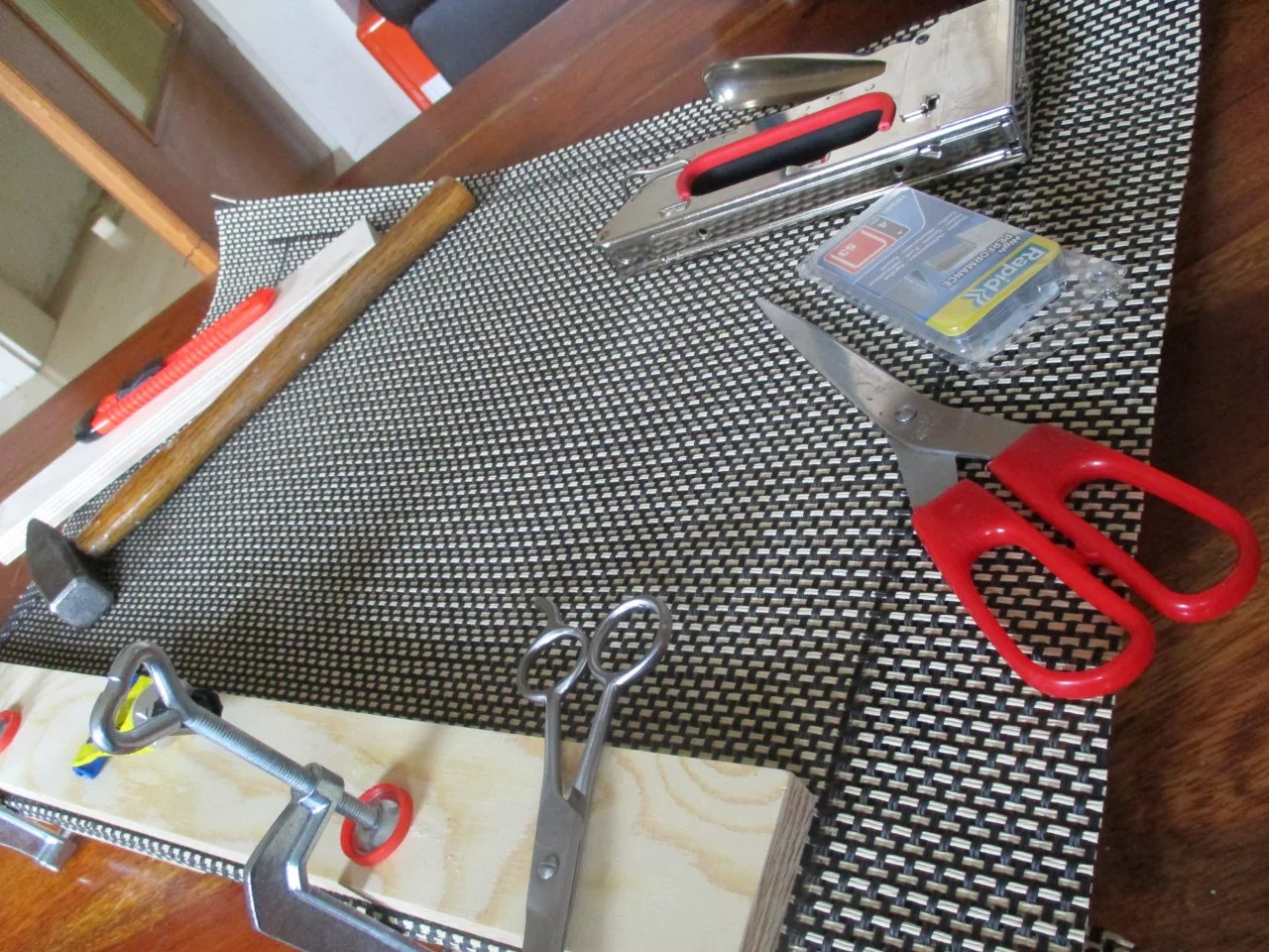Man kann sich etwas behelfen, nämlich durch Sprühkleber. Den trägt man auf Baffleboard und Stoff auf und nach dem Antrocknen klebt dann die Bespannung. Allerdings ist das immer so eine Sache, denn es gilt, den richtigen Moment zu finden, noch spannen zu können, ohne dass der Kleber sofort anzieht. Daher rate ich von sowas eher ab, wenn die Erfahrung fehlt.