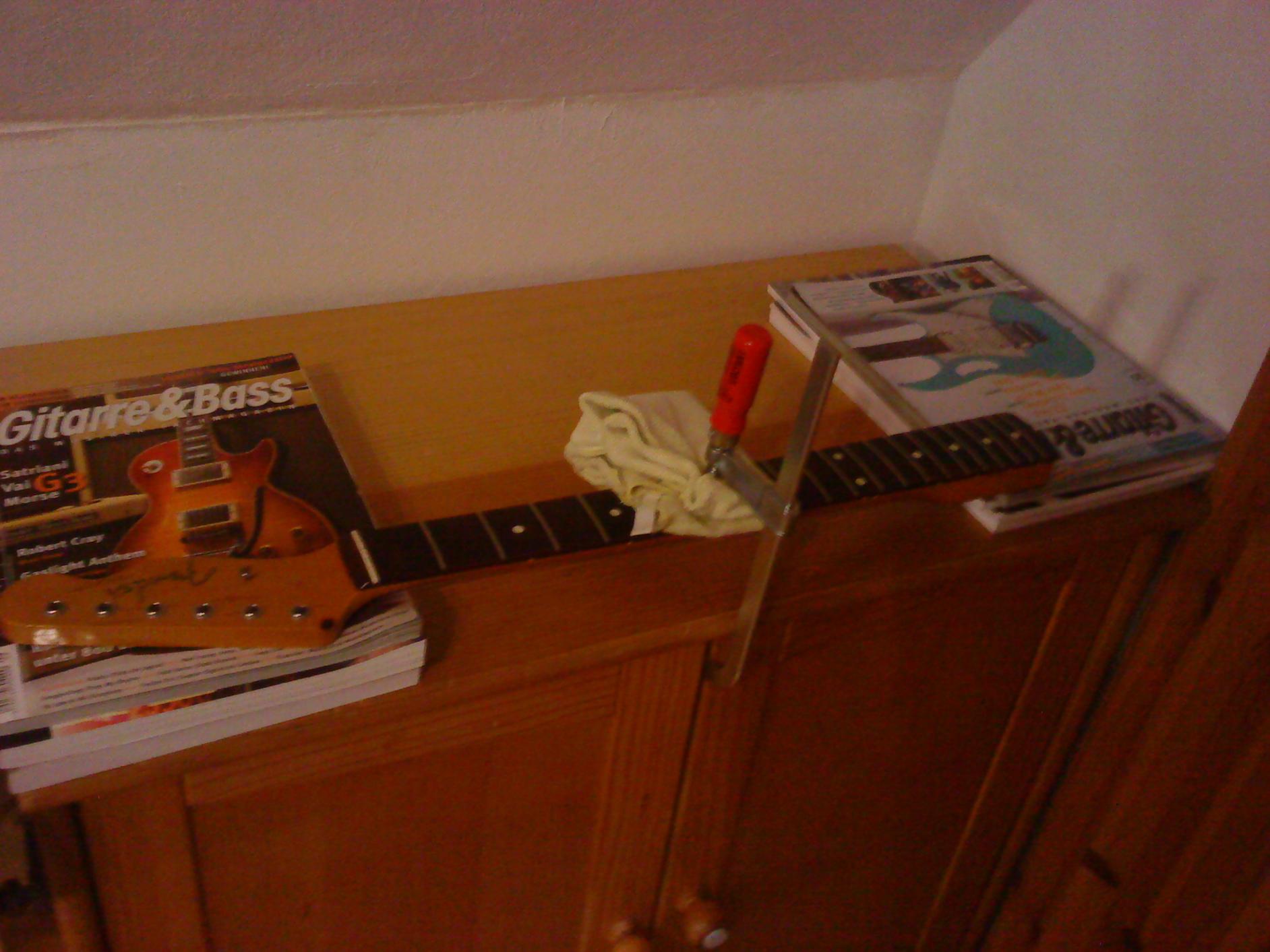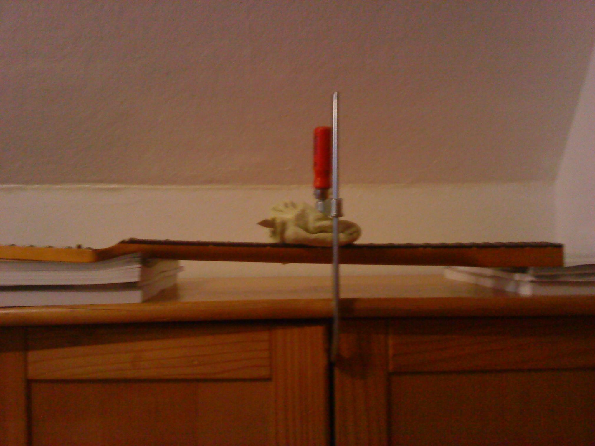Ich bekomme ab und zu auch solche Hälse (meist ältere Fender!!). Da hilft nur die rabiate Methode: Hals abschrauben, Mechaniken abbauen und den Hals auf eine gerade, feste Unterlage Tisch o.Ä.) legen. Unter die Kopfplatte und den Halsfuß etwas Flaches legen, so um die 10mm stark. Auf den Hals in der Mitte etwas zur Schonung der Bünde legen (z.B. Bierdeckel) und mit einer Spannzange oder Schraubzwinge den Hals nach unten durchbiegen. So stark, das man es sehen kann. Den Halsstab natürlich vorher lösen. Das Ganze einige Tage so eingespannt lassen. Ggf. ab und zu einmal mit dem Föhn anwärmen. So habe ich schon mehrere Hälse wieder zurecht "gebogen". Nach dem Lösen der Spannung den Hals sofort einbauen und Saiten aufziehen - am Besten die Stimmung noch für eine Zeit eröhen. Das KANN den Hals retten. Wenn das nicht hilft: Neuer Hals oder neues Griffbrett unter Gegenspannung aufleimen. Arbeit für einen Fachmann.