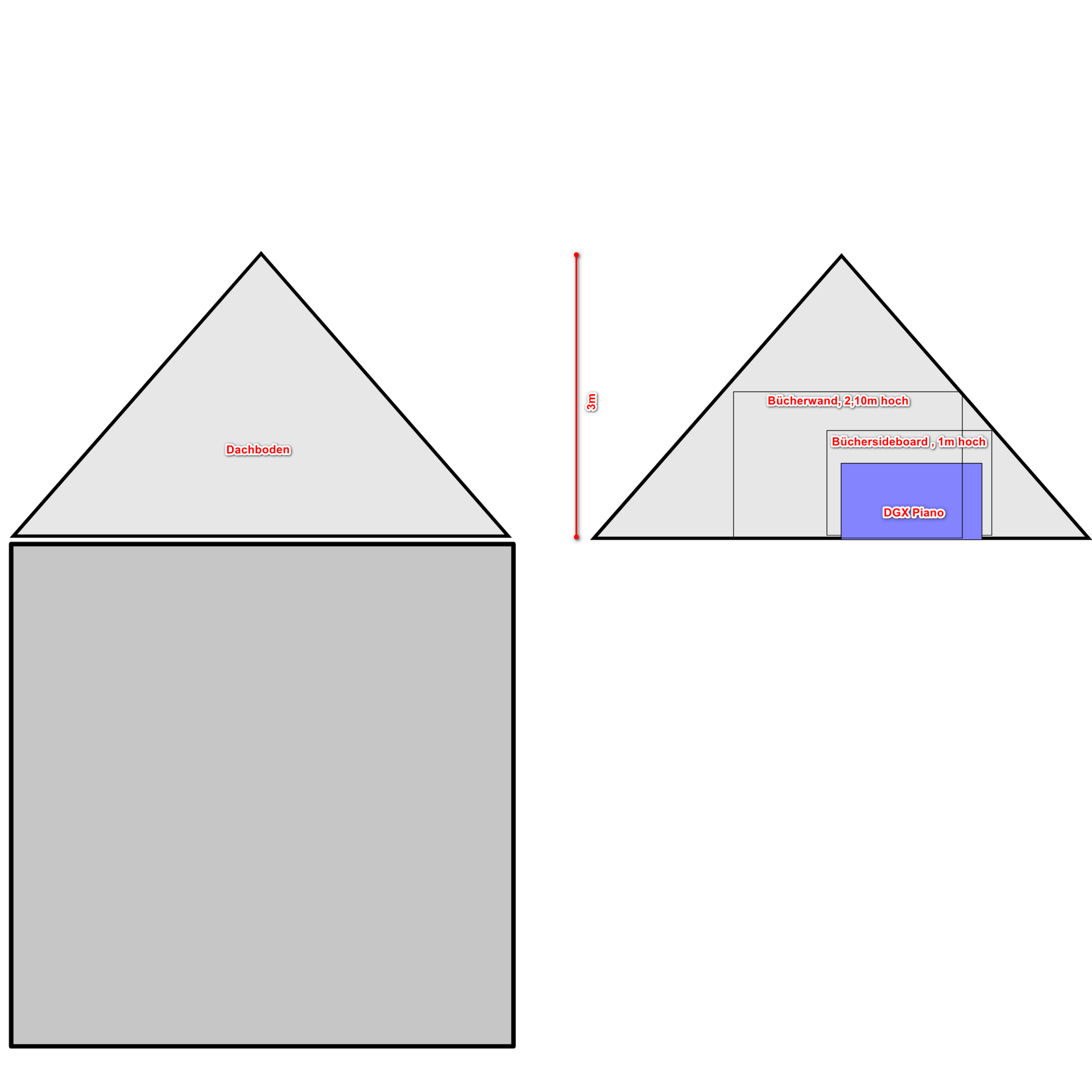 Das Haus hat unserer Wohnung einen ausgebauten ca. 45 qm Dachboden (Bild 1, rechter Teil, nicht ganz maßstabsgerecht) [8x6m ], wo ich mein Arbeits- und Musikzimmer habe ( etwas mehr als 3m Raumhöhe im Gibel) und derzeit das Yamaha DGX steht (s.u.).
