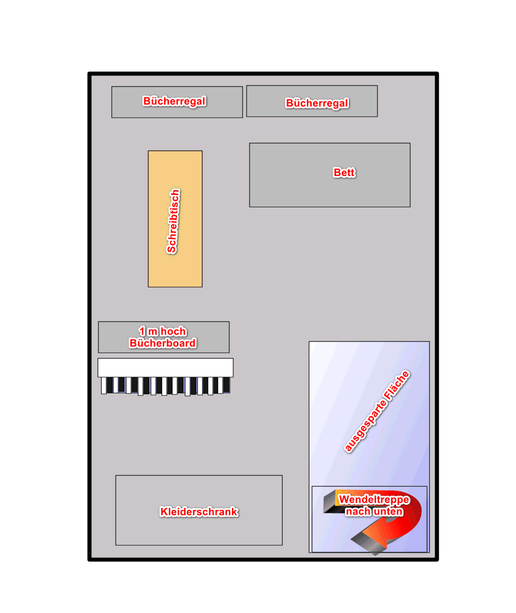 Der Bereich (hellblau) wo die Wendeltreppe ist, ist offen (nach unten zur eigentlichen Wohnung). Unten steht auch mein akkustisches Klavier.