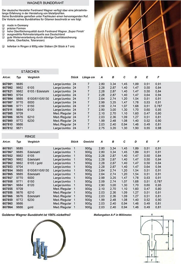 Ich bemängele nicht die Auswahl des Bunddraht Herstellers, sondern die Maße des verwendeten Bunddrahtes. Wir haben uns darauf geeinigt, dass eine nahezu identisches Pendant zu Dunlop 6100 verwendet wird und das ist laut Wagner-Tabelle der Wagner 9665 (siehe Anhang). Mein Stamm-Gitarrenbauer bundiert monatlich mehrere Gitarren (...mit Wagner Bunddraht) und er hat sofort gesehen, dass das kein Pendant des Dunlop 6100 war. Wagner hat allerdings sehr viele "Jumbo" Bunddrähte im Programm, vielleicht hat sich der Gitarrenbauer einfach vergriffen? Ich stand mit dem Gitarrenbauer bereits vor 3 Wochen in Kontakt, da ging es um den Sitar-Effekt. In seiner Mail vermutete er gleich, dass es an einem zu tief gekerbten Sattel liegen könnte. Ehrlich von ihm, find ich gut, da er damit zugibt einen potentiellen Fehler gemacht zu haben. Kommt auf meine Mail demnächst keine Rückmeldung, rufe ich ihn zusätzlich an. Da Du freundlicherweise meinen Thread der Les Paul Standard zitiert hast: Die ist seit Monaten verkauft - die war nix.
