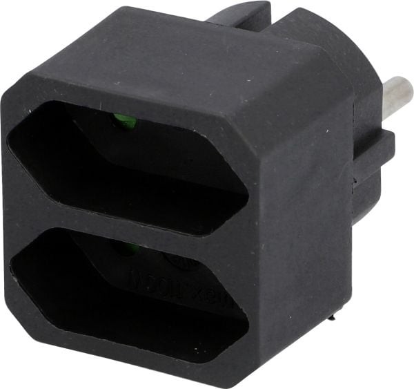 Daher jetzt fixiert mit etwas Gaffa am Nachbarstecker (oben/funktioniert gut). Man sieht, das Tape geht an den Rand der Schuko (?) Rundung des Nachbarsteckers, aber natürlich nicht rein.