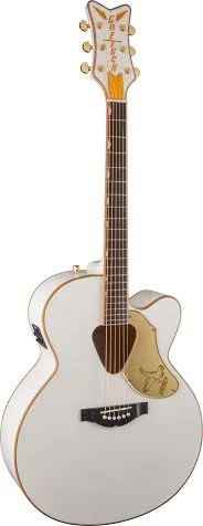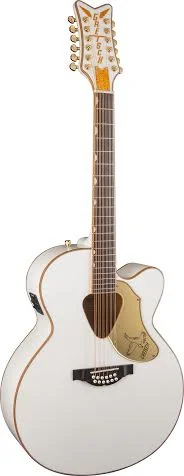 The G5022CWFE Rancher Falcon Jumbo gives players full-on Gretsch Falcon style, sparkling gilded appointments and onboard electronics for peerless amplified tone. Its jumbo cutaway body is finished in gloss white with dazzling gold-sparkle binding on the top, back, sound hole, fingerboard and headstock. Other premium features include a solid spruce top with scalloped X bracing and classic Rancher triangular sound hole, maple sides and arched back, mahogany neck, 21-fret rosewood fingerboard with Neo-Classicthumbnail inlays, V-shaped headstock with vertical winged Gretsch sparkle logo, compensated bridge with rosewood base, deluxe tuners, gold-plated hardware, and Fishman® electronics.