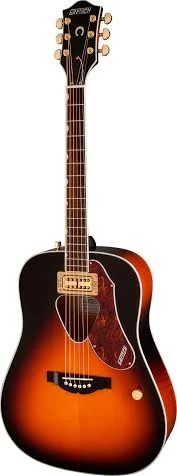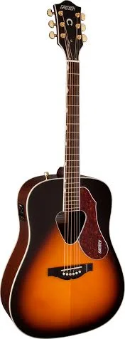Gretschs G5024E Rancher dreadnought is an eminently affordable model with a beautiful Sunburst gloss finish, fine construction and appointments, and onboard electronics for peerless amplified tone. Premium features include a bound solid spruce top with scalloped X bracing and the classic Rancher triangular sound hole (with binding), mahogany sides and bound arched back, mahogany neck, 21-fret rosewood fingerboard with Neo-Classic thumbnail inlays, compensated bridge with rosewood base, deluxe tuners, gold-plated hardware, and Fishman® electronics.