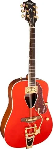 The G5034TFT Rancher is perhaps one of the most distinctive Rancher models ever created, with a beautiful Savannah Sunset gloss finish, a sweet iso-chamber mounted FideliTron pickup for great amplified tone and performance, and even a Bigsby® B70G tailpiece with a wire trem arm. Other premium features include an arched maple top and back with binding, maple sides, classic Rancher triangular sound hole with binding, mahogany neck, 16-fret rosewood fingerboard with Neo-Classic thumbnail inlays, volume control, rocking bar bridge with rosewood base, deluxe tuners, and gold-plated hardware.