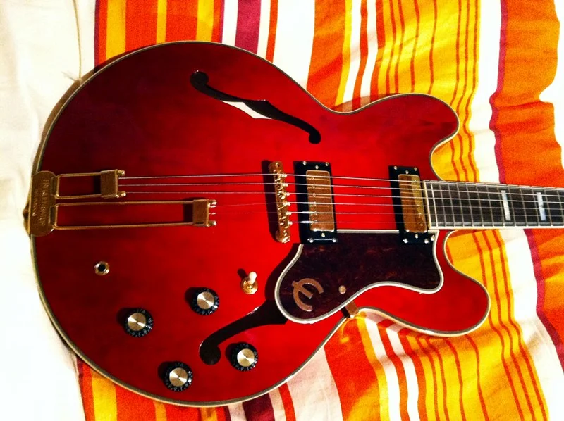 Fazit: Die Elitist Sheraton war die einzige Gitarre, der ich wirklich nachgetrauert hab. Dies hat nun ein Ende: Die 1962 Anniversary Sheraton ist ein würdiger Ersatz. Vorallem da mir das Cherry-Finish und das Frequensator-Tailpiece noch besser gefallen als das Vintage Sunburst mit Stoptail seinerzeit. Verarbeitungsmäßig nicht ganz auf Elitist-Niveau, aber für das Geld auf jeden Fall sehr gut. Soundmäßig in dem Preisbereich ein absoluter Killer - hab vor kurzem eine Gibson Midtown Custom gespielt, die doch deutlich mehr kostet - die kann da nicht mithalten. Die Epiphone ES-345 Limited, die es vor kurzem eine Zeit lang gab und mir damals klanglich auch gut gefiel, ist absolut kein Vergleich. Für mich ist diese Sheraton ganz klar ein "Keeper" - geb ich so schnell nicht mehr her. Endlich eine leistbare Semiakustik mit klassischem Look und hochwertigem Sound.
