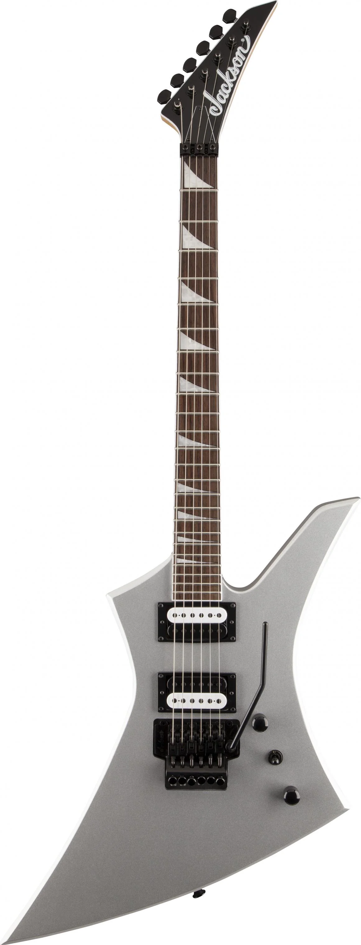 The JS32 Kelly with Floyd Rose comes equipped with a Jackson-branded Floyd Rose double-locking tremolo bridge, dual high-output Jackson humbucking pickups with ceramic magnets and three-way toggle switching, with black hardware and die-cast tuners. Other features include a bolt-on maple speed neck with graphite reinforcement, basswood body and availability in Gloss Black and Quicksilver.